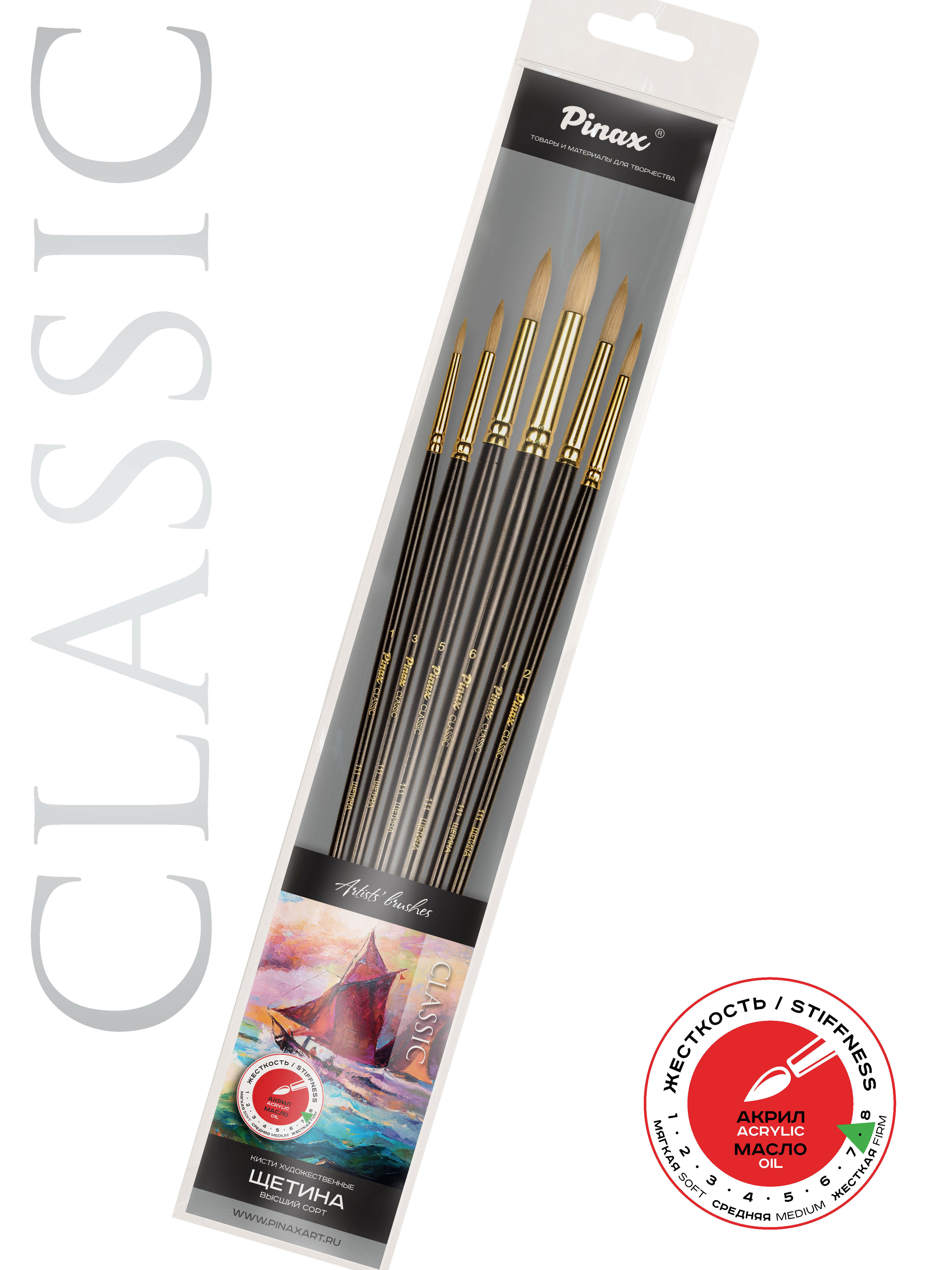 О наборе: в наборе представлены 6 кистей из натуральной щетины с пучком круглой формы. Характеристика: кисти серии изготавливаются вручную. Для производства используется натуральная китайская щетина (Chunking) высокого качества. Щетина перед производством кистей проходит специальную обработку: она отбеливается и очищается химическим составом. Пучок кисти формируется вручную, так чтобы все волоски были направлены к центру, такая форма называется «interlocked». Ворс кисти упругий и даже после длительного использования с растворителями не теряет своей формы. Применение: кисти этой серии в основном используются для работы масляными и акриловыми красками. На усмотрение художника они могут быть использованы с другими художественными материалами. Кисти такой формы удобны для придания специальных эффектов в живописи. Производство: данный товар представлен брендом Pinax. Pinax — мировой бренд товаров, который представлен на российском рынке с начала XXI века. Изначально компания производила только кисти для художественных работ, но затем расширила свое производство и не потеряв качество своей продукции начала производить холсты, мольберты и аксессуары для художников. Сейчас ассортимент включает в себя большое количество наименований.