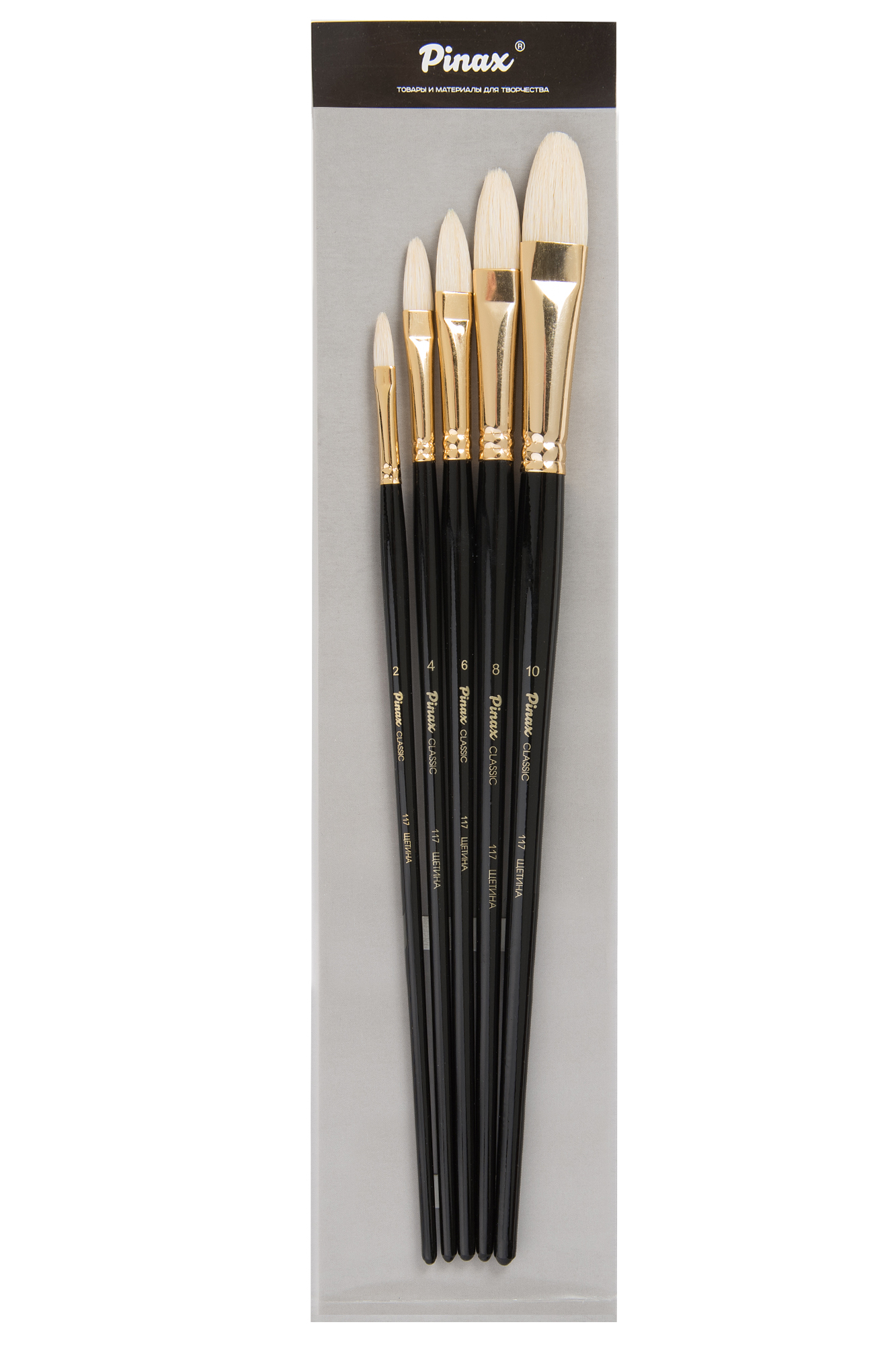 Комплектация: в данный набор входит 5 овальных кистей серии «Artists Classic» изготовленных из щетины (№2, 4, 6, 8 и 10). Характеристика: кисти серии изготавливаются вручную. Для производства используется натуральная китайская щетина (Chunking) высокого качества. Щетина перед производством кистей проходит специальную обработку: она отбеливается и очищается химическим составом. Пучок кисти формируется вручную, так чтобы все волоски были направлены к центру, такая форма называется «interlocked». Ворс кисти упругий и даже после длительного использования с растворителями не теряет своей формы. Кисти производятся на длинной черной ручке. Применение: кисти этой серии в основном используются для работы масляными и акриловыми красками. На усмотрение художника они могут быть использованы с другими художественными материалами. Производство: данный товар представлен брендом Pinax. Pinax — мировой бренд товаров, который представлен на российском рынке с начала XXI века. Изначально компания производила только кисти для художественных работ, но затем расширила свое производство и не потеряв качество своей продукции начала производить холсты, мольберты и аксессуары для художников. Сейчас ассортимент включает в себя большое количество наименований.
