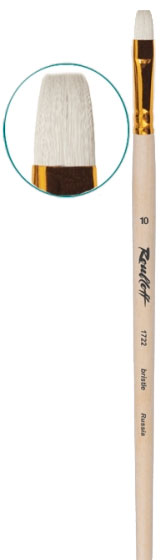 О серии: серия кистей «1722» представляет собой плоские кисти из щетины. В серии представлены кисти от №4 до №20. Характеристики: кисти серии «1722» производятся из специализированной щетины прошедшей обработку. Ворс щетины, используемый для художественных кистей, напоминают по своей форме волоски колонка. Волоски имеют одинаковый диаметр и заострены к верху. Дополнительную упругость и жесткость волоскам придает то, что они прошли дополнительную обработку и отбелены. Кисть имеет пучок плоской формы с укороченной вставкой (использована короткая щетина). Крепление ворса к черенку осуществлено за счет алюминиевой анодированной обоймы. Кисть выполнена на длиной пропитанной лаком ручке. Применение: кисти этой серии применяются для колеровки, нанесения фона или прорисовки фигур прямоугольных форм. Щетина позволяет набирать на кисть большее количество краски и удерживать ее, что позволяет прекрасно работать с темперой, акрилом или маслом. Производство: изготавливаются под брендом Roubloff, который был основан в 1988 году в Кировской области (Россия). Кировская область – один из центров народных промыслов в России. Здесь же занимаются разведением пушных зверей, чей мех является идеальным материалом для кистей. Продукция бренда Roubloff – кисти самого разного назначения, размера и формы. Весь материл, используемый при производстве продукции, проходит отбор, чтобы каждый клиент получил лучшие кисти для своих работ. Кисти марки Roubloff являются одними из лучших в России.