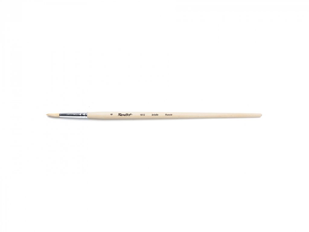 О серии: серия кистей «1612» представляет собой плоские кисти из щетины. В серии представлены кисти от №4 до №14. Характеристики: кисти серии «1612» производятся из специализированной щетины прошедшей обработку. Ворс щетины, используемый для художественных кистей, напоминают по своей форме волоски колонка. Волоски имеют одинаковый диаметр и заострены к верху. Дополнительную упругость и жесткость волоскам придает то, что они прошли дополнительную обработку и отбелены. Кисть имеет пучок круглой формы с заостренным кончиком. Крепление ворса к черенку осуществлено за счет алюминиевой обоймы. Кисть выполнена на длиной пропитанной лаком ручке. Применение: кисть позволяет набирать на себя большее количество краски и удерживать ее, что позволяет прекрасно работать с такими материалами, как акрил и масло. На усмотрение художника возможно использование с другими художественными материалами. Производство: изготавливаются под брендом Roubloff, который был основан в 1988 году в Кировской области (Россия). Кировская область – один из центров народных промыслов в России. Здесь же занимаются разведением пушных зверей, чей мех является идеальным материалом для кистей. Продукция бренда Roubloff – кисти самого разного назначения, размера и формы. Весь материл, используемый при производстве продукции, проходит отбор, чтобы каждый клиент получил лучшие кисти для своих работ. Кисти марки Roubloff являются одними из лучших в России.