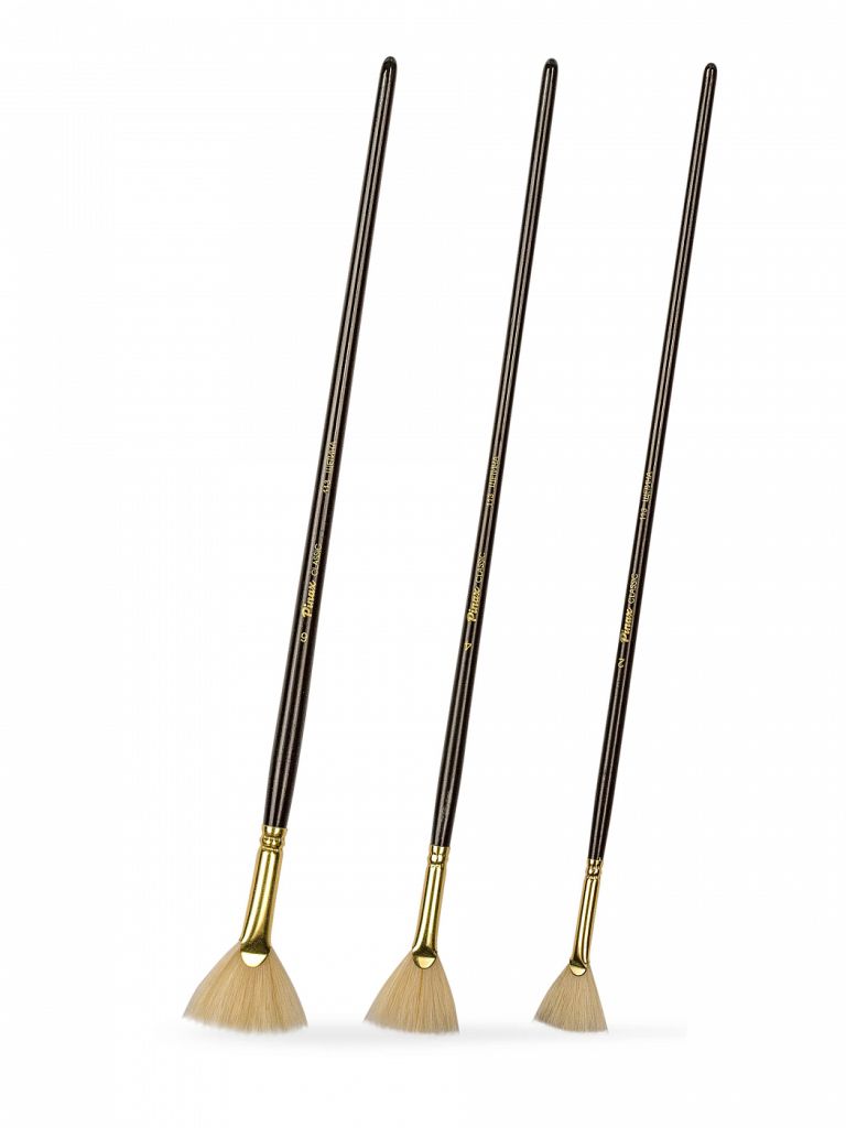 О наборе: в наборе представлены 3 веерные кисти из натуральной щетины с разным размером пучка на длинной ручке. Характеристика: кисти серии изготавливаются вручную. Для производства используется натуральная китайская щетина (Chunking) высокого качества. Щетина перед производством кистей проходит специальную обработку: она отбеливается и очищается химическим составом. Пучок кисти формируется вручную, так чтобы все волоски были направлены к центру, такая форма называется «interlocked». Ворс кисти упругий и даже после длительного использования с растворителями не теряет своей формы. Пучок кисти отличается от других кистей свой формой, которая визуально напоминает веер. Кисти производятся на длинной ручке, которая покрыта тремя слоями рояльного лака. Применение: кисти этой серии в основном используются для работы масляными и акриловыми красками. На усмотрение художника они могут быть использованы с другими художественными материалами. Кисти такой формы удобны для придания специальных эффектов в живописи. Производство: данный товар представлен брендом Pinax. Pinax — мировой бренд товаров, который представлен на российском рынке с начала XXI века. Изначально компания производила только кисти для художественных работ, но затем расширила свое производство и не потеряв качество своей продукции начала производить холсты, мольберты и аксессуары для художников. Сейчас ассортимент включает в себя большое количество наименований.