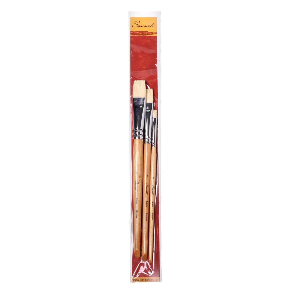 Художественные кисти Sonnet из щетины отлично подойдут для работы маслом и другими красками с плотной текстурой. Натуральный ворс из щетины обладает оптимальной жесткостью и упругостью, позволяет создавать уверенные мазки и фактурные рельефы в пастозной технике. В наборе представлено три кисти круглой и плоской формы.