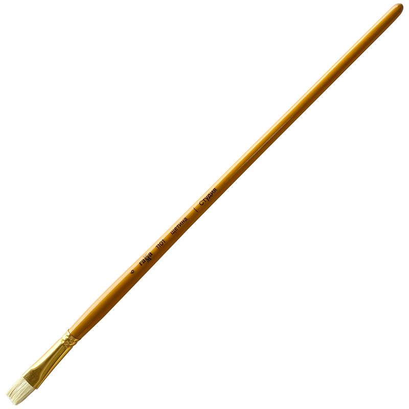 Кисти серии «Студия» рекомендуются для масляной живописи, ворс изготовлен из натуральной свиной щетины. Издавна этот материал применяется для художественных кистей, в меру жесткий, износостойкий, благодаря своей упругости позволяет контролировать мазок. Кисти придается чашеобразная форма, позволяющая набрать максимальное количество краски на кисть. Кисти плоской формы с длинной ручкой из березы, покрытой двумя слоями лака.