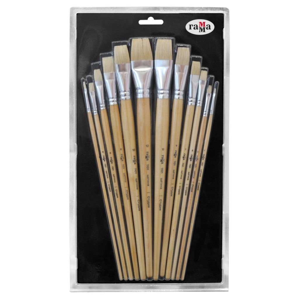 Набор художественных кистей ГАММА серии «Студия» состоит из 12 плоских кистей размеров. Кисти идеально подходят для масляной живописи. Ворс кистей «Студия» изготовлен из натуральной свиной щетины. Этот материал давно применяется для художественных кистей: он в меру жесткий, износостойкий и благодаря своей упругости позволяет контролировать мазок. Кисти из щетины хорошо подходят для работы маслом и акрилом в пастозных техниках. Кисти придается чашеобразная форма, позволяющая набрать максимальное количество краски на кисть. Кисти имеют длинную ручку из берёзы, покрытую двумя слоями лака.