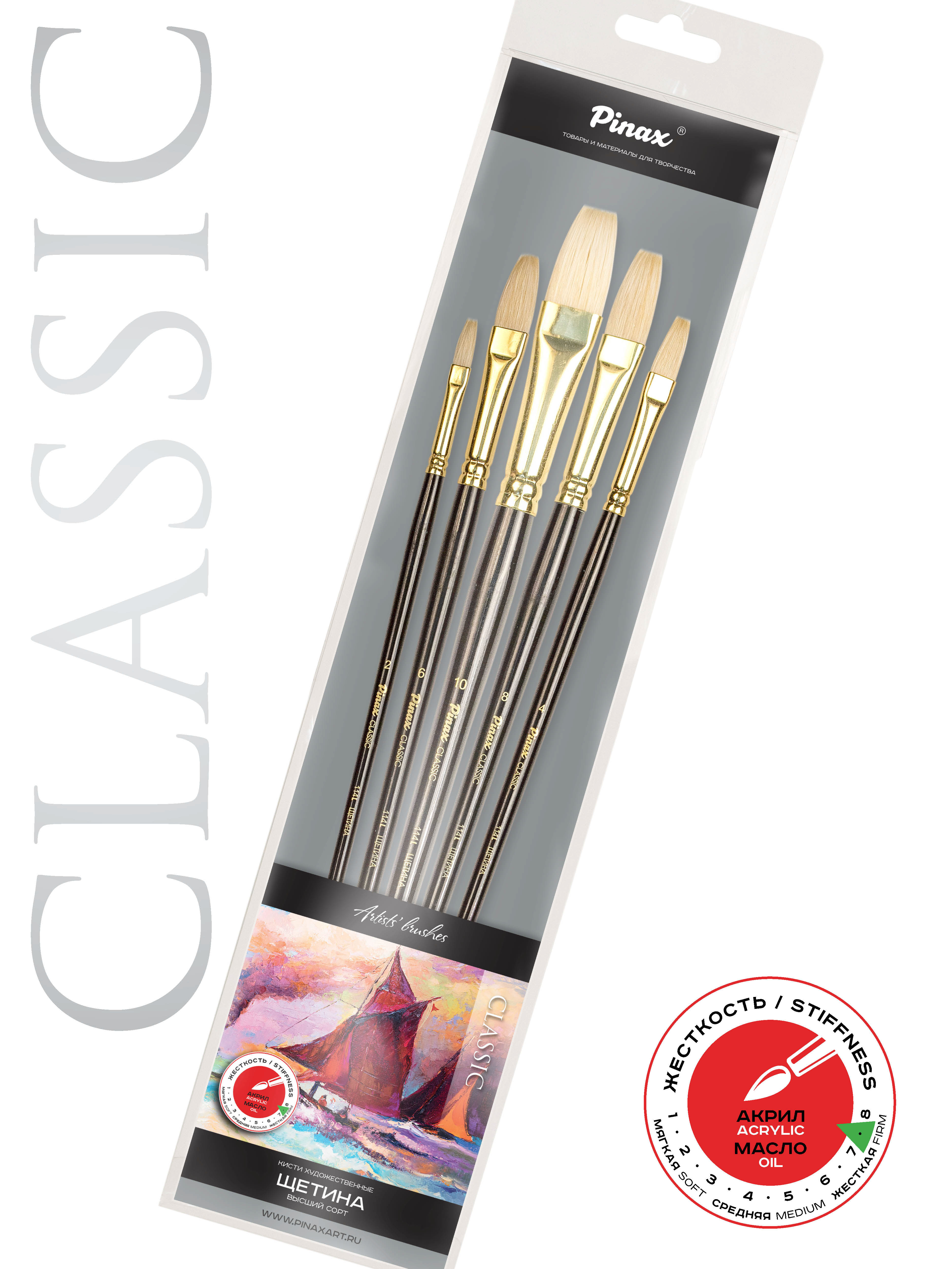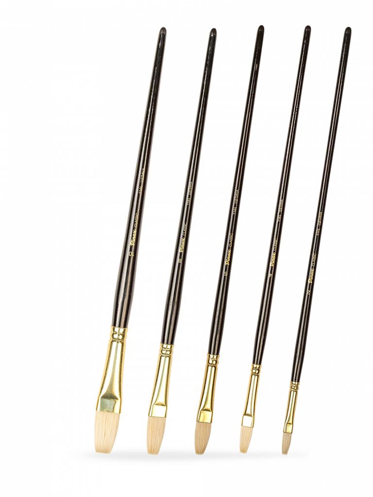 О наборе: в наборе представлены 5 кистей из натуральной щетины с пучком плоской формы с удлиненной выставкой. Характеристика: кисти серии изготавливаются вручную. Для производства используется натуральная китайская щетина (Chunking) высокого качества. Щетина перед производством кистей проходит специальную обработку: она отбеливается и очищается химическим составом. Пучок кисти формируется вручную, так чтобы все волоски были направлены к центру, такая форма называется «interlocked». Ворс кисти упругий и даже после длительного использования с растворителями не теряет своей формы. Применение: кисти этой серии в основном используются для работы масляными и акриловыми красками. На усмотрение художника они могут быть использованы с другими художественными материалами. Кисти такой формы удобны для придания специальных эффектов в живописи. Производство: данный товар представлен брендом Pinax. Pinax — мировой бренд товаров, который представлен на российском рынке с начала XXI века. Изначально компания производила только кисти для художественных работ, но затем расширила свое производство и не потеряв качество своей продукции начала производить холсты, мольберты и аксессуары для художников. Сейчас ассортимент включает в себя большое количество наименований.