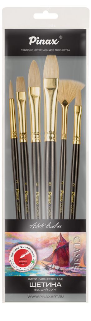 В производстве кистей данной серии используется лучшая щетина китайского борова из провинции Chungking (Китай), отбеленная и очищенная специальным химическим составом. Волоски подобраны вручную и направлены к центру (конструкция interlocked), благодаря чему кисть даже после продолжительного использования не потеряет свою форму. В пучке около 80% волосков с расщепленным кончиком. Поэтому кисть хорошо наполняется пигментом и отдает краску. Упругий и прочный свиной волос отлично подходит для работы с тяжелыми масляными и акриловыми красками. Щетина износоустойчива к сильным растворителям.