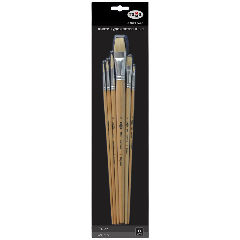 Набор художественных кистей ГАММА серии «Студия» состоит из 6 кистей востребованных форм и размеров: круглые № 2, 6, 10; плоские № 2, 6, 10. Кисти идеально подходят для масляной живописи. Ворс кистей «Студия» изготовлен из натуральной свиной щетины. Этот материал давно применяется для художественных кистей: он в меру жесткий, износостойкий и благодаря своей упругости позволяет контролировать мазок. Кисти придается чашеобразная форма, позволяющая набрать максимальное количество краски на кисть. Кисти имеют длинную ручку из берёзы, покрытую двумя слоями лака. Ширина плоских кистей – 5; 11; 22 мм, а диаметр круглых – 3; 5; 7 мм. Выставка, длина волоса от обоймы до кончика кисти, составляет 10; 19; 25; 9; 17; 25 мм. Упаковка набора – пластиковый блистер с европодвесом и картонной подложкой. • Номер: 2, 6, 10; • Форма кисти: круглая, плоская; • Волос: щетина; • Серия: Студия; • Тип ручки: длинная; • Диаметр для круглых кистей: 3; 5; 7 мм; • Ширина для плоских кистей: 5; 11; 22 мм; • Выставка: 10; 19; 25; 9; 17; 25 мм.