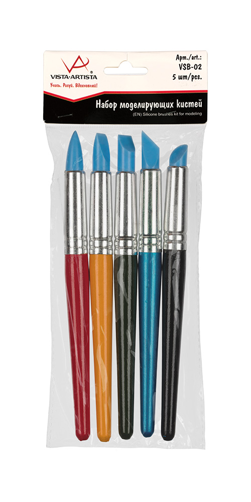 В наборе 5 кистей с наконечником из силикона. Кисти предназначены для работы с глиной, пластилином и прочими материалами для лепки, могут использоваться в живописи для нанесения краски в пастозной технике или для создания барельефов и основ для творчества.