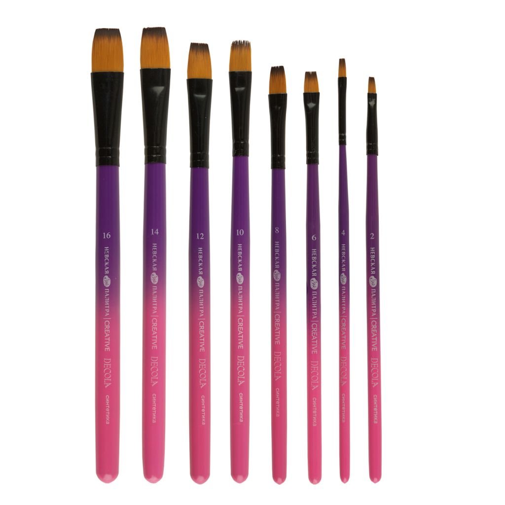 Синтетическая кисть на короткой ручке из прочного и лёгкого металла, что придаёт кисти долговечность и устойчивость. Металлическая ручка также обеспечивает удобство в использовании и позволяет художнику легко контролировать движения кисти. Это особенно важно при выполнении тонких и детальных работ. Ворс кистей сделан из синтетики и имеет ряд преимуществ перед натуральным, включая устойчивость к химическим воздействиям, долговечность и возможность использования с широким спектром красок. Кисти с плоской формой пучка представлены в разных размерах, в ярком дизайне. Кисти подходят для работы с различными типами красок, включая акрил, масло, акварель и гуашь. Благодаря своей универсальности, она подойдёт как начинающими, так и опытным художникам.
