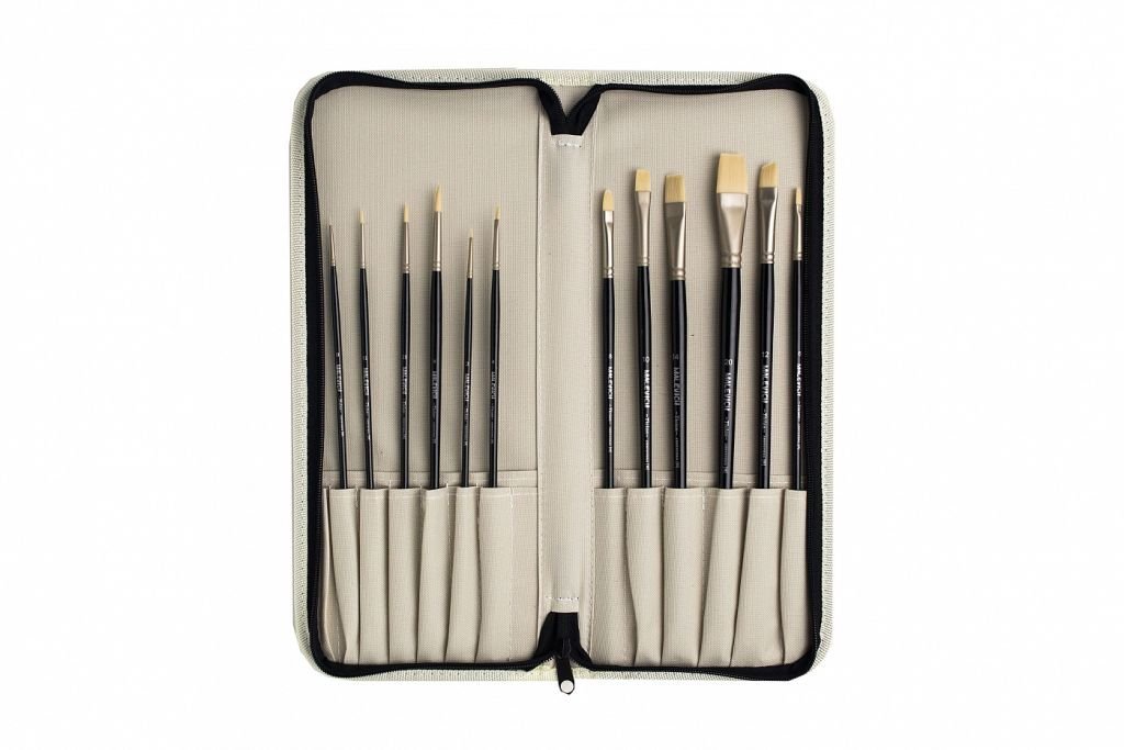 Кисти серии Tician от компании «Малевичъ» изготовлены из жесткой синтетики белого цвета, имитирующей щетину. Этот ворс отлично подходит для густых красок, таких как масло, акрил, гуашь, темпера. Кисти выполнены в благородной цветовой гамме: черная лаковая ручка с лаконичной маркировкой и матовая металлическая втулка теплого оттенка делают эти кисти не только надежным художественным инструментом, но и красивым аксессуаром. Кисть держит свою форму даже при частом использовании, ворс прочно закреплен, а втулка не расшатывается со временем. Ручка - длинная. Выставка - короткая. Номер кисти соответствует диаметру обоймы в миллиметрах. В набор входят: бежевый пенал «Малевичъ» для хранения кистей (15.5х37см), а также 12 кистей из серии Tician: круглые №0, №1.5, №2.5, №4; плоские №2, №4, №6, №10, №14, №20; плоскоовальная №8; скошенная №12.