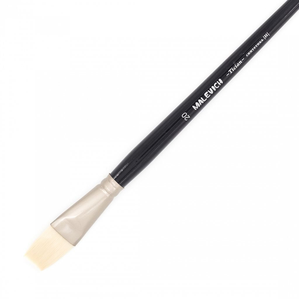 Кисти серии Tician изготовлены из жесткой синтетики белого цвета имитирующей щетину. Этот ворс отлично подходит для густых красок таких как масло, акрил, гуашь, темпера. Кисти выполнены в благородной цветовой гамме. Матовая втулка с теплым металлическим оттенком, черный лак и лаконичная маркировка делают эти кисти не только надежным художественным инструментом, но и красивым аксессуаром. Кисть держит свою форму даже при частом использовании, ворс прочно закреплен, а втулка не расшатывается со временем. Ручка кисти длинная - 25 см. Длина ворса (выставка) короткая. Номер кисти соответствует диаметру пучка в миллиметрах