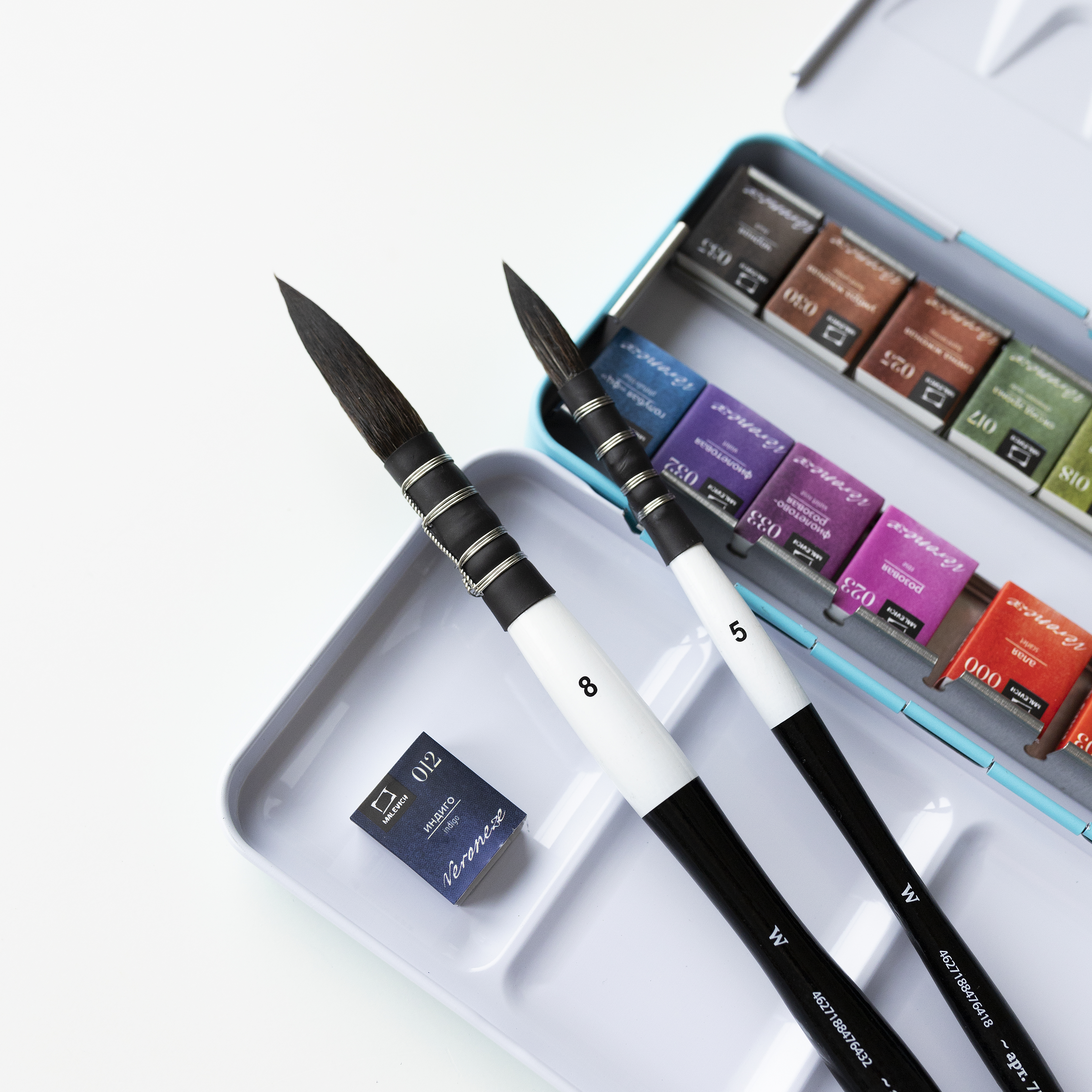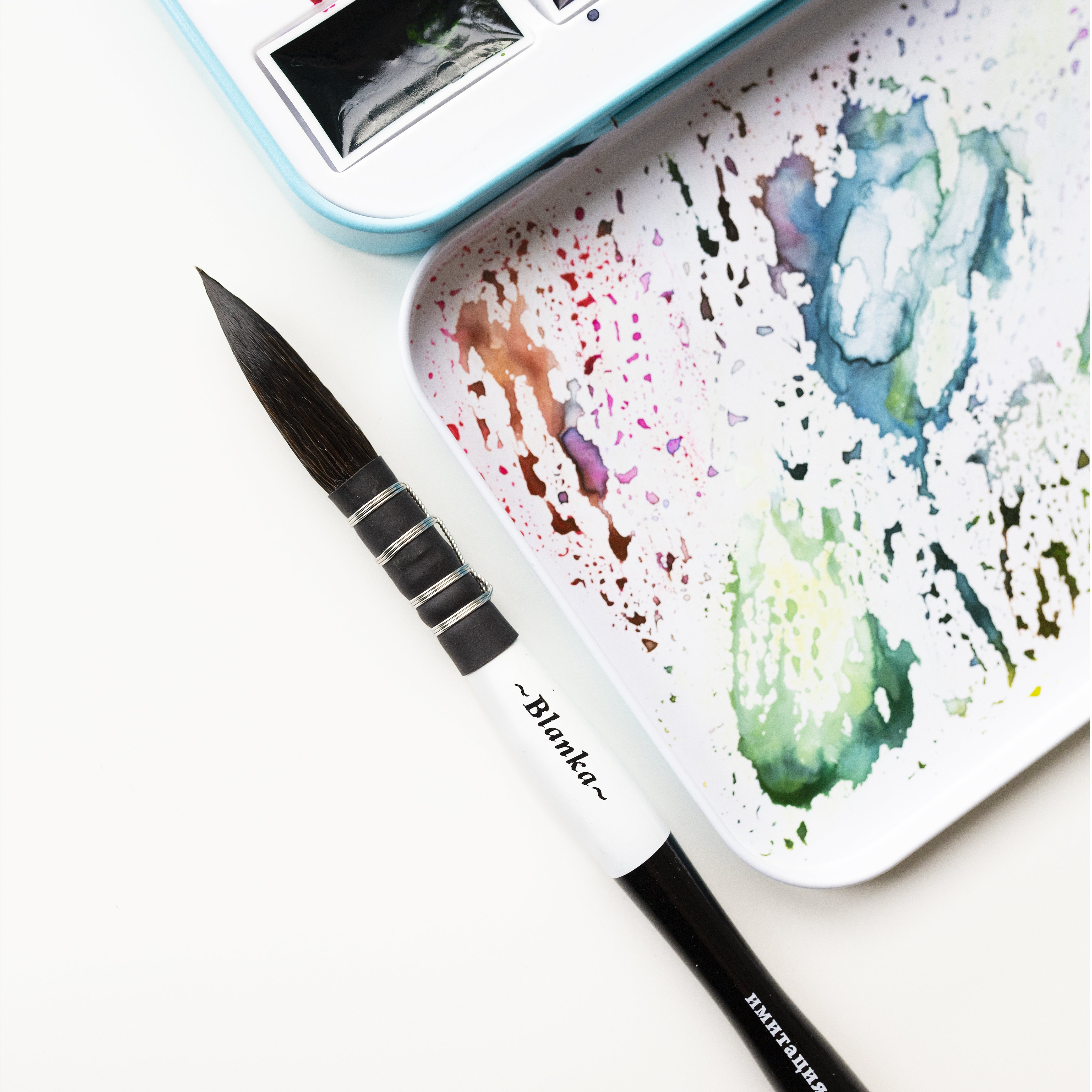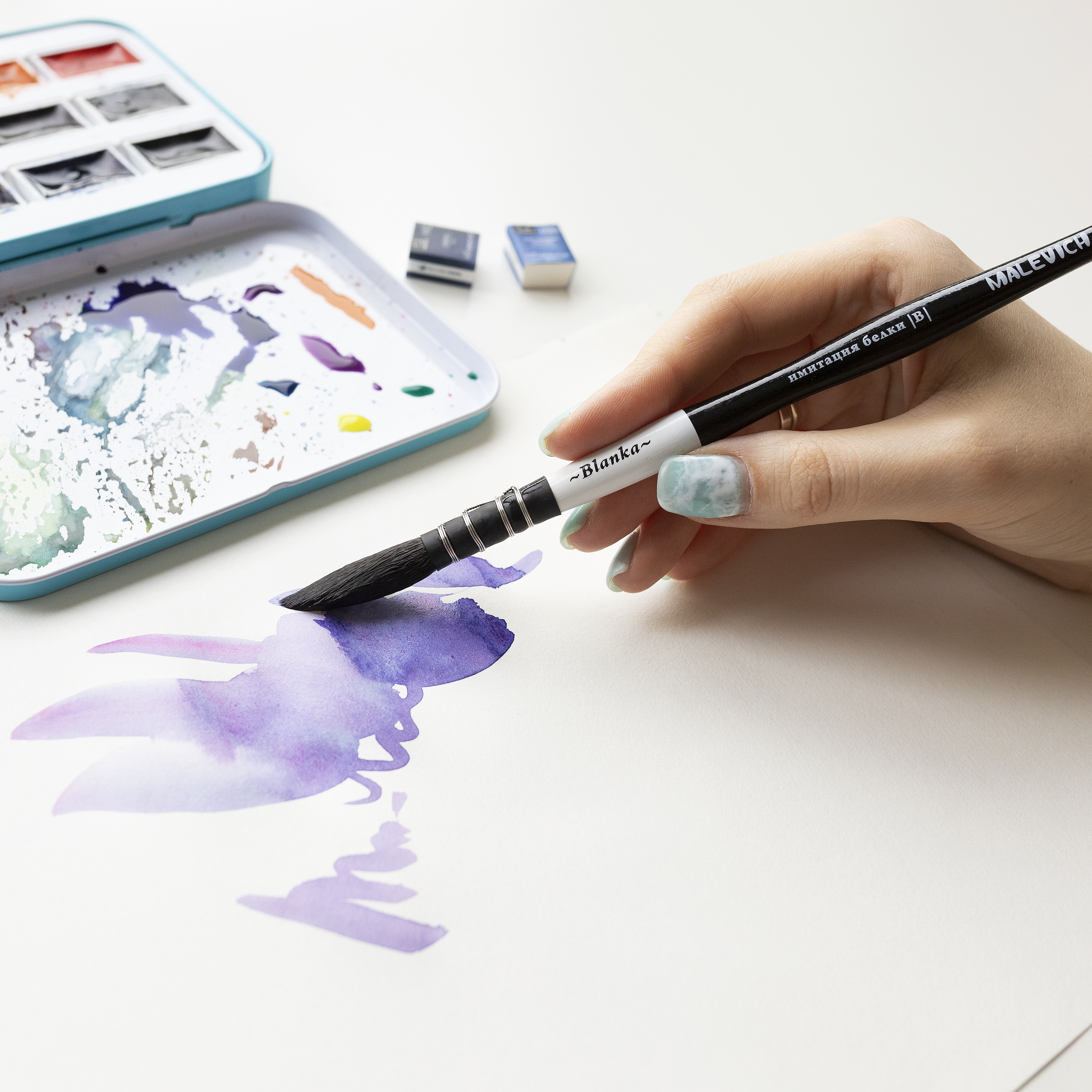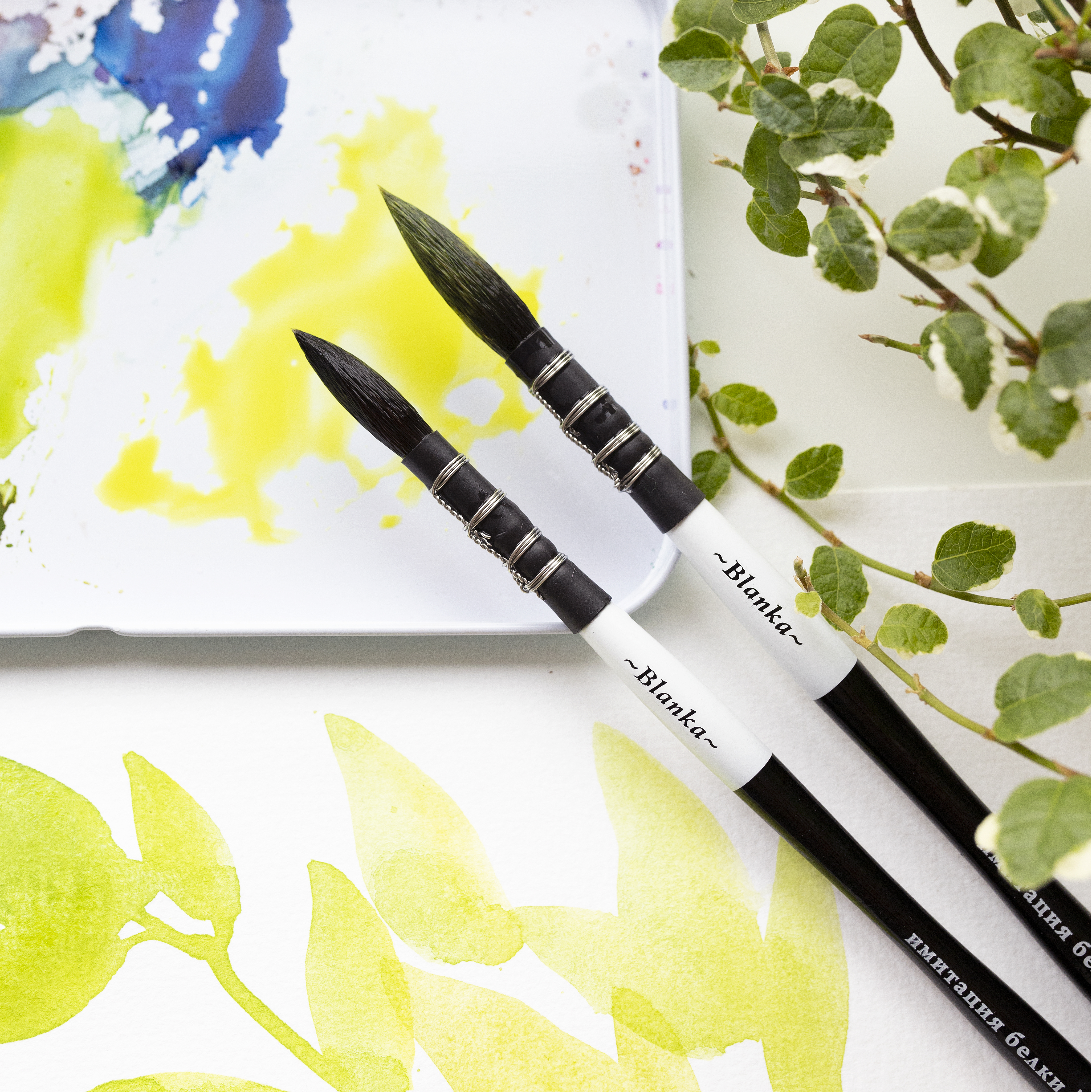 Кисти Blanka изготовлены из мягкой синтетики черного цвета, имитирующей белку. Такой ворс отлично подходит для акварели. Благодаря удлиненному ворсу кисть впитывает больше влаги и дольше удерживает ее. Практичные кисти данной серии сочетают в себе преимущества натурального ворса и износостойкости синтетики, а значит меньше изнашиваются. Лаконичный дизайн и черно-белая цветовая гамма выглядят благородно и делают эти кисти не только надежным художественным инструментом, но и красивым аксессуаром. В серии представлены кисти с французским типом крепления, который обеспечивает более длинную выставку ворса и максимально продолжительную линию. Благодаря нескользящему покрытию кисти удобно держать в руках.