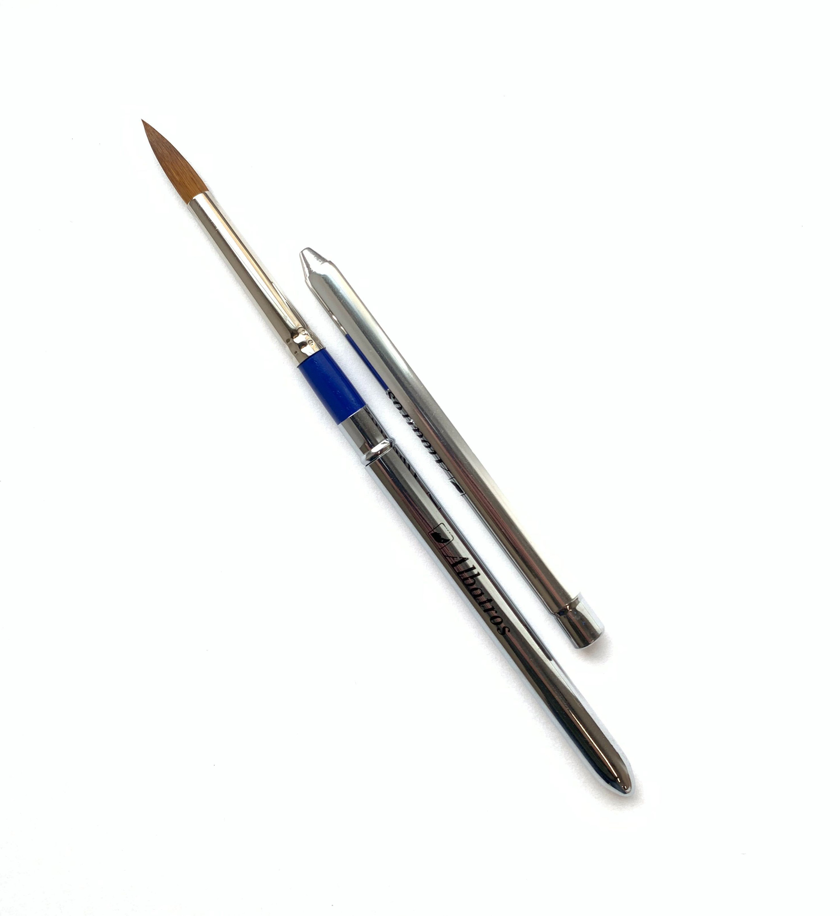 О серии: профессиональные кисти для акварельной живописи. Кисти изготавливаются из синтетического ворса, который по своим свойствам имитирует ворс колонка. Особенностью данной серии является наличие футляра, который накручивается в качестве ручки кисти. По завершению работы, рабочая часть кисти отделяется и помещается внутрь полой металлической ручки. Такая особенность делает кисти данной серии идеальными для работы на пленэрах и вне студии. Характеристика: для производства кистей этой серии использован специализированный синтетический волос, который по своим качествам напоминает волос колонка. Кисти из такого материала мягкие и эластичные. Кисти изготовлены с пучком круглой формы. Такие кисти идеально подходят для акварельной живописи и для работ другими водорастворимыми красками. Применение: серия разработана для выполнения работ в техниках акварельной живописи. Подходит для профессионального использования.