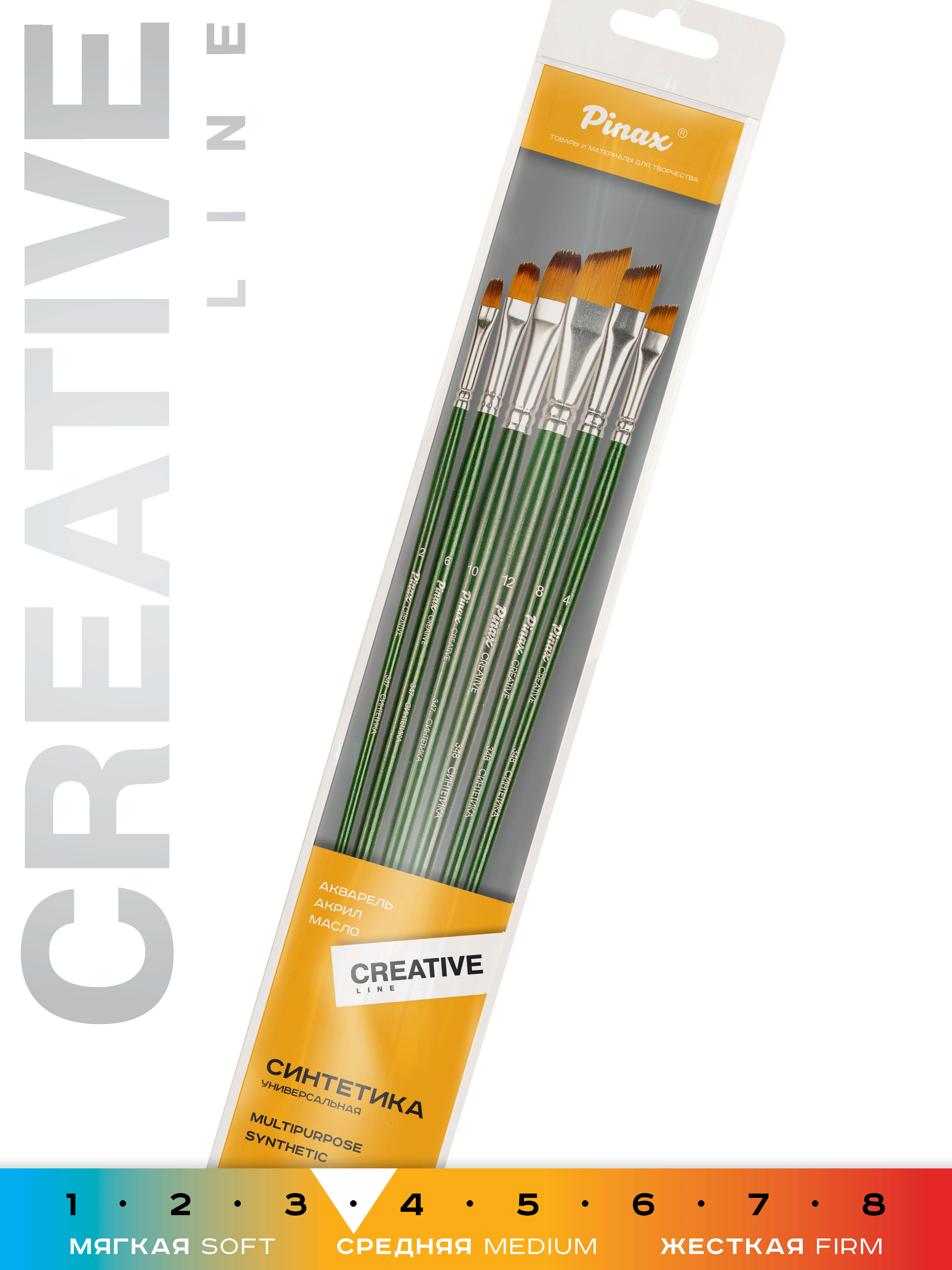 О наборе: в наборе 6 кистей с пучком плоской и скошенной формой разных размеров. Характеристика: кисти этой серии изготавливаются из высококачественной синтетики золотисто-оранжевого цвета (Golden Taklon). Волос таких кистей имеет среднюю жесткость и хорошо держит свою форму. Кисти изготовлены на длинной деревянной ручке, покрытой полупрозрачным лаком зеленого цвета. Крепление ворса к черенку кисти выполнено за счет алюминиевой втулки. Применение: кисти этой серии универсальны в своем применении. Они подходят для художников всех уровней и могут использоваться для работы разными художественными красками и лаками. Производство: данный товар представлен брендом Pinax. Pinax — мировой бренд товаров, который представлен на российском рынке с начала XXI века. Изначально компания производила только кисти для художественных работ, но затем расширила свое производство и не потеряв качество своей продукции начала производить холсты, мольберты и аксессуары для художников. Сейчас ассортимент включает в себя большое количество наименований.