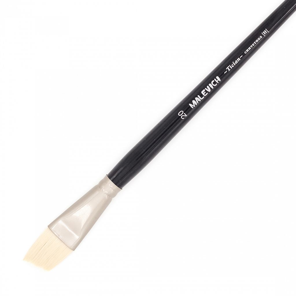 Кисти серии Tician от компании "Малевичъ" изготовлены из жесткой синтетики белого цвета, имитирующей щетину. Этот ворс отлично подходит для густых красок - таких, как масло, акрил, гуашь, темпера. Кисти выполнены в благородной цветовой гамме: черная лаковая ручка с лаконичной маркировкой и матовая металлическая втулка теплого оттенка делают эти кисти не только надежным художественным инструментом, но и красивым аксессуаром. Кисть держит свою форму даже при частом использовании, ворс прочно закреплен, а втулка не расшатывается со временем. Ручка - длинная (25 см). Выставка (длина ворса) - короткая. Номер кисти соответствует диаметру обоймы в миллиметрах.