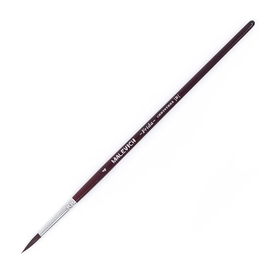 Синтетические нейлоновые кисти серии "Frida" от Малевичъ - это кисти с мягким эластичным ворсом. Имеют острый кончик, который долго не стирается. Подходят для акварели и гуаши, хороши для академической техники живописи и лессировок, хорошо держат воду. По свойствам напоминают натуральную белку. Латунная обойма с антикоррозийным покрытием и двойным обжимом. Березовая ручка длиной 18см покрыта глянцевым темно-красным лаком. Длина ворса (выставка) короткая. Номер кисти соответствует диаметру в миллиметрах.