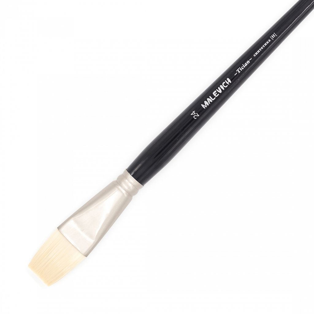 Кисти серии Tician изготовлены из жесткой синтетики белого цвета имитирующей щетину. Этот ворс отлично подходит для густых красок таких как масло, акрил, гуашь, темпера. Кисти выполнены в благородной цветовой гамме. Матовая втулка с теплым металлическим оттенком, черный лак и лаконичная маркировка делают эти кисти не только надежным художественным инструментом, но и красивым аксессуаром. Кисть держит свою форму даже при частом использовании, ворс прочно закреплен, а втулка не расшатывается со временем. Ручка кисти длинная - 25 см. Длина ворса (выставка) короткая. Номер кисти соответствует диаметру пучка в миллиметрах