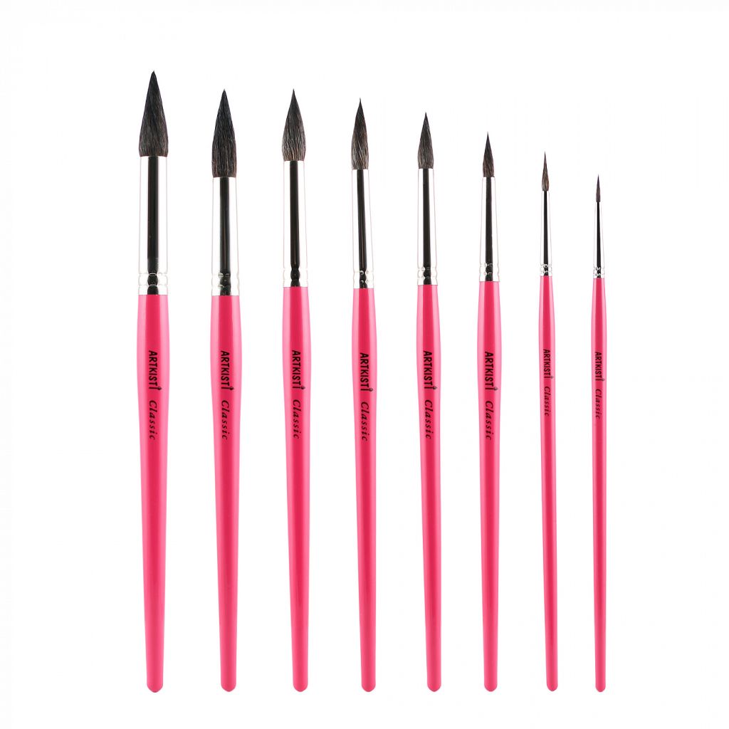 Характеристика: для производства кистей этой серии использован натуральный ворс черной сибирской белки 50% и черной синтетики 50%. Кисти из такого материала мягкие и эластичные. Кисти изготовлены с круглым пучком, который заострен к кончику. Пучок кисти надежно зафиксирован цельнотянутой металлической обоймой. Кисти выполнены на короткой деревянной ручке. Диаметр мазка соответствует номеру кисти. Применение: кисти этой серии используются в основном для выполнения работ в техниках акварельной живописи. На усмотрение художника возможно использование с другими художественными материалами. Производство: изготавливается компанией «Альбатрос», которая начала свою деятельность в 1989 году в городе Новосибирск. Компания хорошо зарекомендовала себя на рынке художественных товаром. Она постоянно работает над расширением своего ассортимента. Сегодня «Альбатрос» выпускает художественные кисти, холсты, ящики для красок и различные аксессуары для художников.