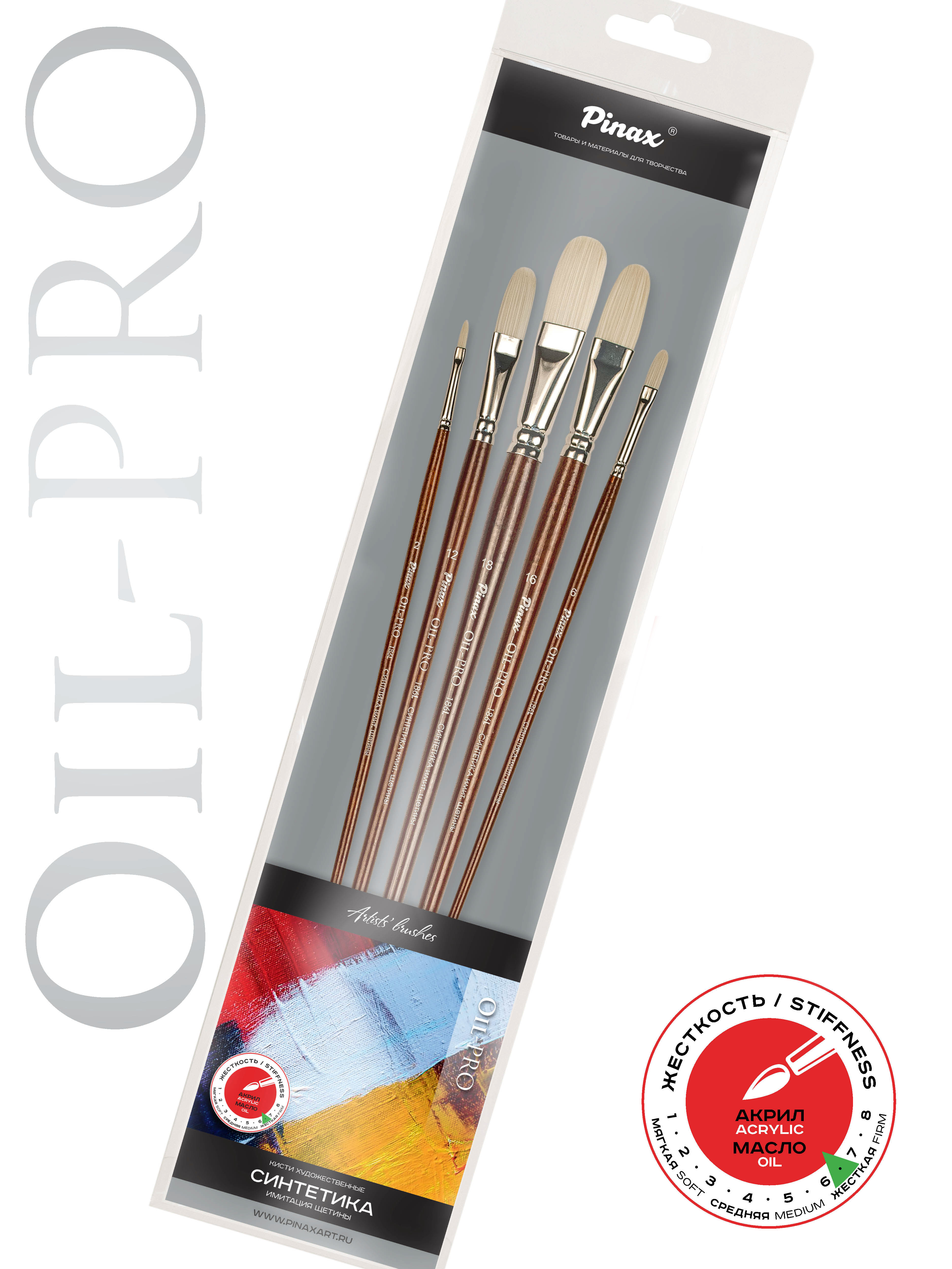 О наборе: в наборе 5 кистей с овальной формой пучка с удлиненной выставкой. Характеристика: кисти серии Pinax Oil-PRO сделаны из высококачественной синтетической имитации щетины производства Японии и выдержат любые испытания самыми густыми красками и растворителями, обеспечивая равномерное нанесение масляных или акриловых красок даже без разбавления - прямо из тюбика. Белая синтетика Pinax Oil-PRO имитирует структуру натуральной свиной щетины - комбинация сверхпрочных и гладких синтетических волокон нескольких различных диаметров удерживает максимальный объем краски на кисти, так, как это делают расщепленные кончики на волосках натуральной щетины из региона Chungking, однако синтетика отличается большей износостойкостью и лучше удерживает краску, равномерно отдавая ее на холст. В отличие от кистей из натуральной щетины, такая кисть лучше держит форму независимо от степени приложенного давления, что дает больше контроля мазка и позволяет точнее наносить цвет. Применение: кисти Pinax Oil-PRO идеально подходят для работы густыми красками — масло и акрил. Производство: данный товар представлен брендом Pinax. Pinax — мировой бренд товаров, который представлен на российском рынке с начала XXI века. Изначально компания производила только кисти для художественных работ, но затем расширила свое производство и не потеряв качество своей продукции начала производить холсты, мольберты и аксессуары для художников. Сейчас ассортимент включает в себя большое количество наименований.