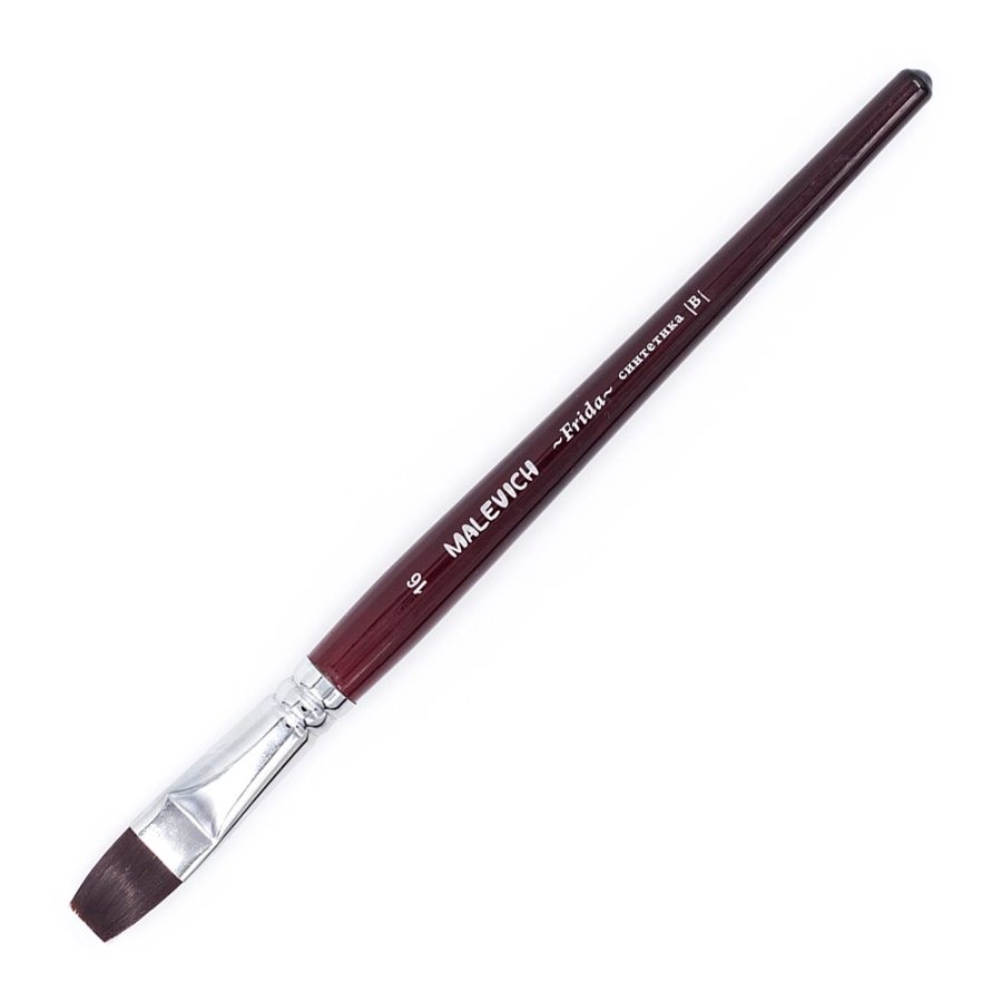Синтетические нейлоновые кисти серии "Frida" от Малевичъ - это кисти с мягким эластичным ворсом. Имеют плоскую форму и острый кончик, который долго не стирается. Подходят для акварели и гуаши, хороши для академической техники живописи и лессировок, хорошо держат воду. По свойствам напоминают натуральную белку. Латунная обойма с антикоррозийным покрытием и двойным обжимом. Березовая ручка длиной 18см покрыта глянцевым темно-красным лаком. Длина ворса (выставка) короткая. Номер кисти соответствует диаметру в мм.