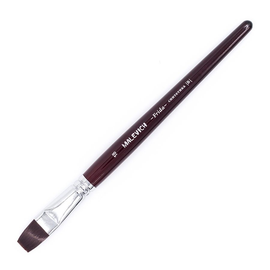Синтетические нейлоновые кисти серии "Frida" от Малевичъ - это кисти с мягким эластичным ворсом. Имеют плоскую форму и острый кончик, который долго не стирается. Подходят для акварели и гуаши, хороши для академической техники живописи и лессировок, хорошо держат воду. По свойствам напоминают натуральную белку. Латунная обойма с антикоррозийным покрытием и двойным обжимом. Березовая ручка длиной 18см покрыта глянцевым темно-красным лаком. Длина ворса (выставка) короткая. Номер кисти соответствует диаметру в мм.