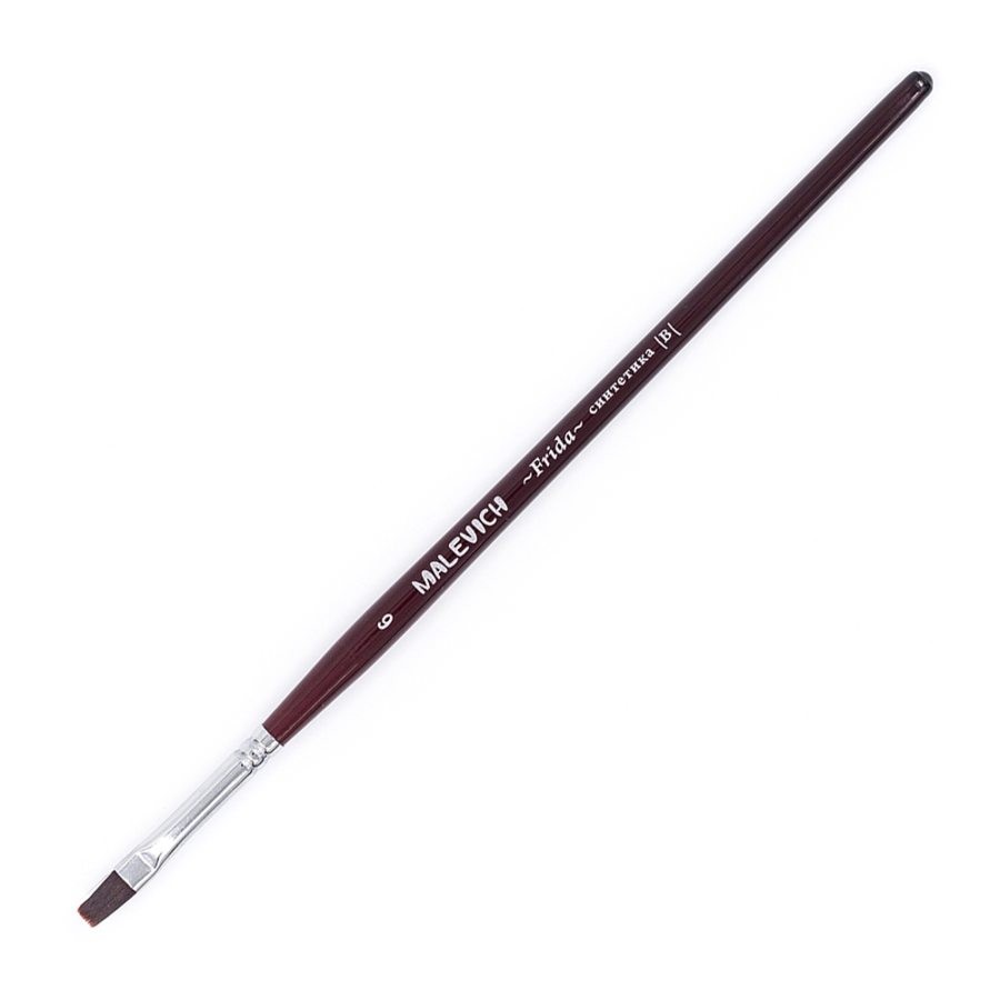 Синтетические нейлоновые кисти серии "Frida" от Малевичъ - это кисти с мягким эластичным ворсом. Имеют плоскую форму и острый кончик, который долго не стирается. Подходят для акварели и гуаши, хороши для академической техники живописи и лессировок, хорошо держат воду. По свойствам напоминают натуральную белку. Латунная обойма с антикоррозийным покрытием и двойным обжимом. Березовая ручка длиной 18см покрыта глянцевым темно-красным лаком. Длина ворса (выставка) короткая. Номер кисти соответствует диаметру в мм.