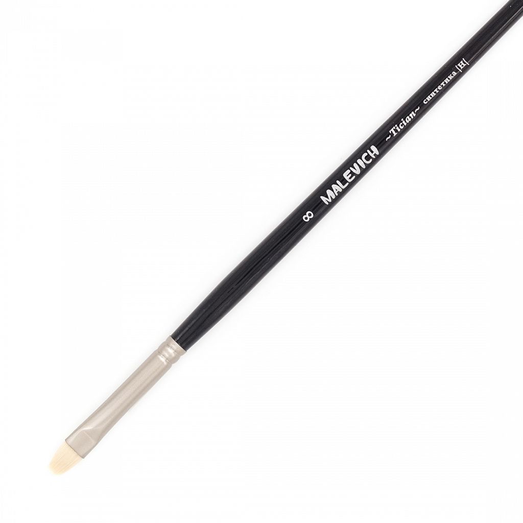 Кисти серии Tician изготовлены из жесткой синтетики белого цвета имитирующей щетину. Этот ворс отлично подходит для густых красок таких как масло, акрил, гуашь, темпера. Кисти выполнены в благородной цветовой гамме. Матовая втулка с теплым металлическим оттенком, черный лак и лаконичная маркировка делают эти кисти не только надежным художественным инструментом, но и красивым аксессуаром. Кисть держит свою форму даже при частом использовании, ворс прочно закреплен, а втулка не расшатывается со временем. Ручка кисти длинная - 25 см. Длина ворса (выставка) короткая. Номер кисти соответствует диаметру пучка в миллиметрах.