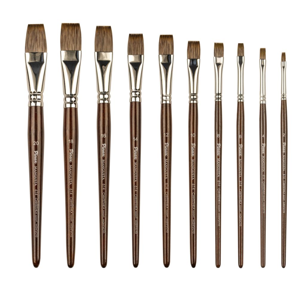 Характеристика: каждая кисть в линейке Pinax Mangusta состоит из высококачественных 100% синтетических волокон средней жесткости. Уникальное синтетическое волокно кистей Pinax Mangusta повторяет структуру натурального волоса мангуста — каждая ворсинка имеет заостренный кончик и текстуру поверхности натурального волоса мангуста — жестче колонка, но мягче свиной щетины, идеальна для масляной живописи. Мягкие и эластичные, но невероятно прочные, эти кисти на длинной ручке идеально подходят для работы в технике лессировки, обеспечивают надежный контроль мазка и равномерно отдают краску на живописную основу. Пестрый рисунок синтетических волокон перекликается с натуральным волосом мангуста – от смеси темно-коричневого и бежевого до золотистого на кончике кисти. Применение: кисти Pinax Mangusta предназначены для работ масляными и акриловыми красками. Производство: данный товар представлен брендом Pinax. Pinax — мировой бренд товаров, который представлен на российском рынке с начала XXI века. Изначально компания производила только кисти для художественных работ, но затем расширила свое производство и не потеряв качество своей продукции начала производить холсты, мольберты и аксессуары для художников. Сейчас ассортимент включает в себя большое количество наименований.