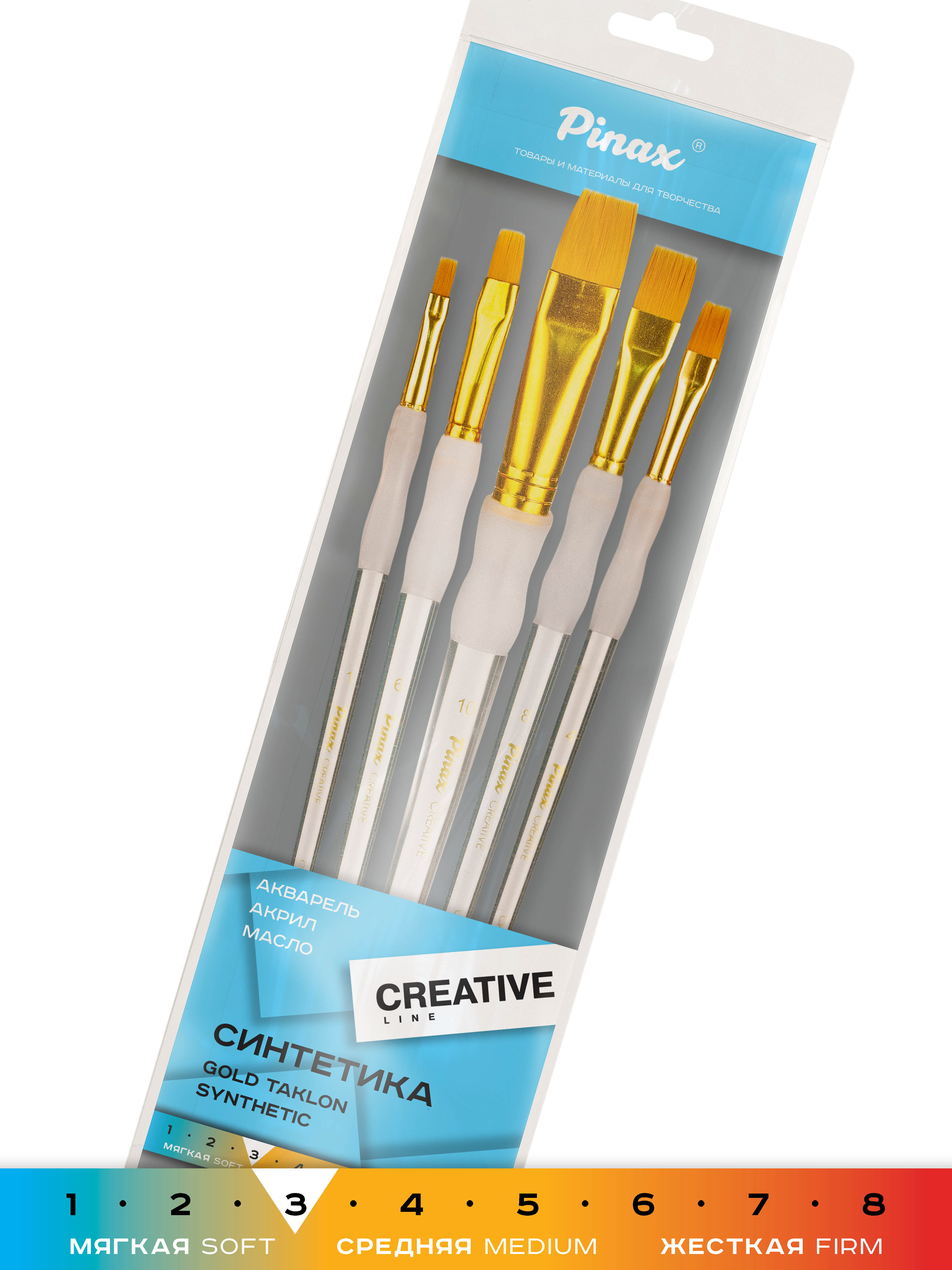 О наборе: в наборе 5 кистей с пучком плоской формы разных размеров на короткой акриловой ручке с эргономичной вставкой в зоне обхвата. Характеристика: кисти из универсальной золотистой синтетики — эластичный и управляемый синтетический ворс отлично набирает краску и равномерно отдает на поверхность, а тонкий кончик у круглых кистей позволяет работать с мельчайшими деталями. Отличительная особенность данной серии в специальной ручке с мягкой вставкой для удобного хвата - пальцы не устанут даже после самых продолжительных работ. Применение: кисти серии подходят для широкого круга потребителей, они одинаково удобны для учащихся и для профессиональных художников. Кисти универсальны в применении, походят для выполнения работ различными видами красок — акрил, акварель, гуашь. Производство: данный товар представлен брендом Pinax. Pinax — мировой бренд товаров, который представлен на российском рынке с начала XXI века. Изначально компания производила только кисти для художественных работ, но затем расширила свое производство и не потеряв качество своей продукции начала производить холсты, мольберты и аксессуары для художников. Сейчас ассортимент включает в себя большое количество наименований.