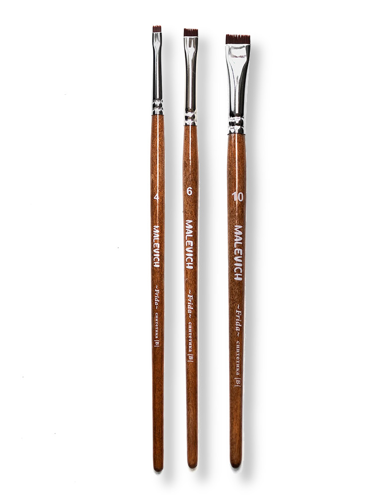 Кисть-ластик Малевич Frida из жесткой синтетики с укороченной вставкой используется для смывания слоя краски на местах бликов или осветления освещенной части. Внешний срез кисти собирается в четкую линию, а благодаря укороченной выставке промытая и отжатая от воды кисть становится настоящим ластиком для акварели. Кисть успешно справляется с задачей снятия краски в акварельной заливке, восстановлением бликов и рефлексов.