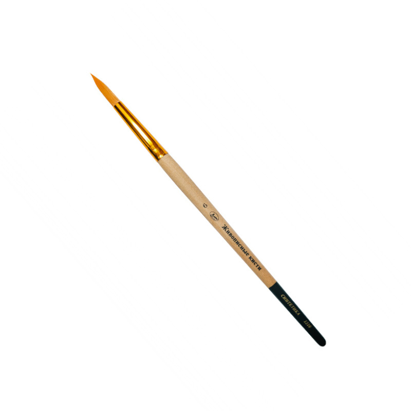 О серии: круглая кисть из жесткого синтетического ворса является отличным инструментом в живописных пастозных техниках. Эргономичность короткой ручки позволит с комфортом работать над моделированием объема с тщательной деталировкой, а лаковое покрытие предотвратит проникновение влаги в дерево. Анодированная алюминиевая обойма надежно защищает ворсинки от потери структуры и выпадения. Универсальность формы пучка с укороченной выставкой позволяет обозначать дальний план средними и крупными мазками, а также объекты ближнего плана композиции, - листья деревьев, траву, движущиеся волны - расставлять акценты в виде бликов. Применение: кисти этой серии применяются для работы масляными и акриловыми красками. Производство: производятся под брендом "Живописные кисти". Этот бренд известен многим художникам. Производство располагается в Кировской области на фабрике, которая работает с конца прошлого века. Производитель постоянно совершенствует технологии производства, сохраняя при этом уникальные "кировские" способы обработки ворса. "Живописные кисти" - это широкий ассортимент кистей для работы со всеми художественными красками.