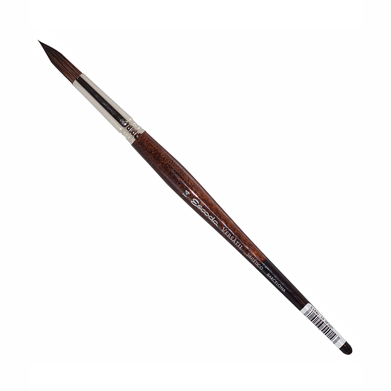 О серии: серия кистей «Versatil 1540» представлена синтетическими кистями круглой формы. Кисти отличаются от других кистей значительно удлинённым ворсом и обладают пучком круглой формы, который заострён к кончику. В серии представлены кисти от №3/0 до №22. Все кисти серии выполнены на короткой деревянной ручке, которая окрашена в два тона коричневого цвета. Характеристика: кисти серии «Versatil 1540» - это синтетические кисти, которые являются современной альтернативой кистям из натурального ворса колонка. Замена натурального ворса на синтетический придаёт кистям долговечность. Для изготовления таких кистей используются специально подобранные синтетические волокна (нити) разного диаметра. Кисти этой серии сочетают в себе лучшие качества: упругость и эластичность. Также они могут выдерживать много краски. Диаметр пучка, в зависимости от номера кисти, варьируется от 0,50 до 15,60 миллиметров. Применение: кисти отлично подойдут для работы не только водорастворимыми красками, но и акриловыми и масляными, на усмотрение художника могут быть использованы с другими художественными материалами. Производство: изготавливаются компанией «Escoda». В 1933 году, в Испании неподалёку от Барселоны, Джозеп Эскода основал фабрику по изготовлению художественных кистей. С первых дней существования компания придерживается мнения, что только из лучших материалов можно создать кисти лучшего качества. Поэтому в производстве используются тщательно подобранные материалы, например, ворс таймырского колонка и русской белки, а также китайская щетина. Отличительной особенностью кистей является тройной обжим обоймы. Этот приём был впервые применён компанией «Escoda» и в дальнейшем запатентован. Тройной обжим позволяет избежать пустого пространства в обойме и создаёт устойчивое сцепление ворса и основания кистей.