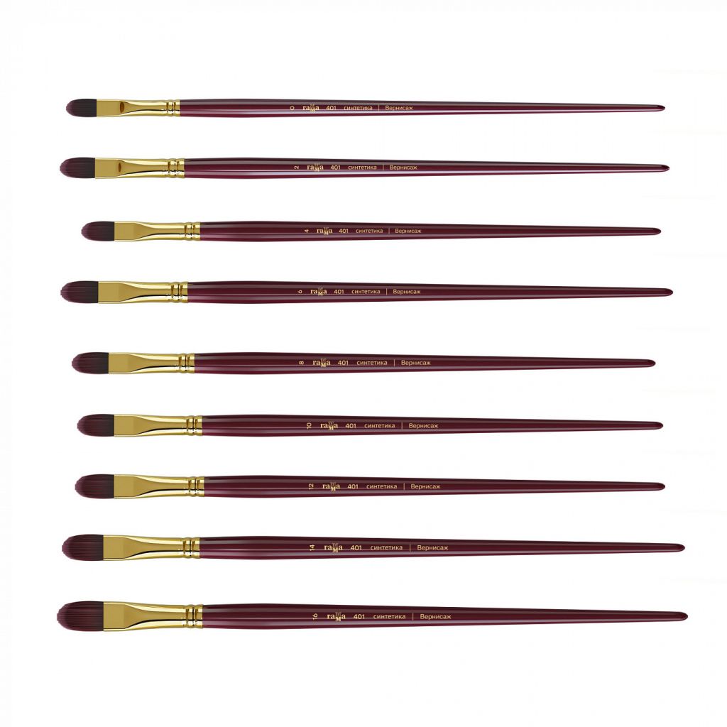 Кисть средней жесткости из высококачественного синтетического ворса бордового цвета. Пучок проклеен химически-стойким клеем и надежно прикреплен к древку кисти. Кисть на длинной ручке, покрытой глянцевым лаком насыщенного бордового цвета, совпадающим с цветом ворса. Тончайший синтетический ворс хорошо набирает и отдает краску, при этом отлично держит форму, сочетая упругость с удивительно тонким чувством мазка. Кисть подходит для работы с акриловыми и масляными красками, а так же другими материалами для живописи и декорирования.