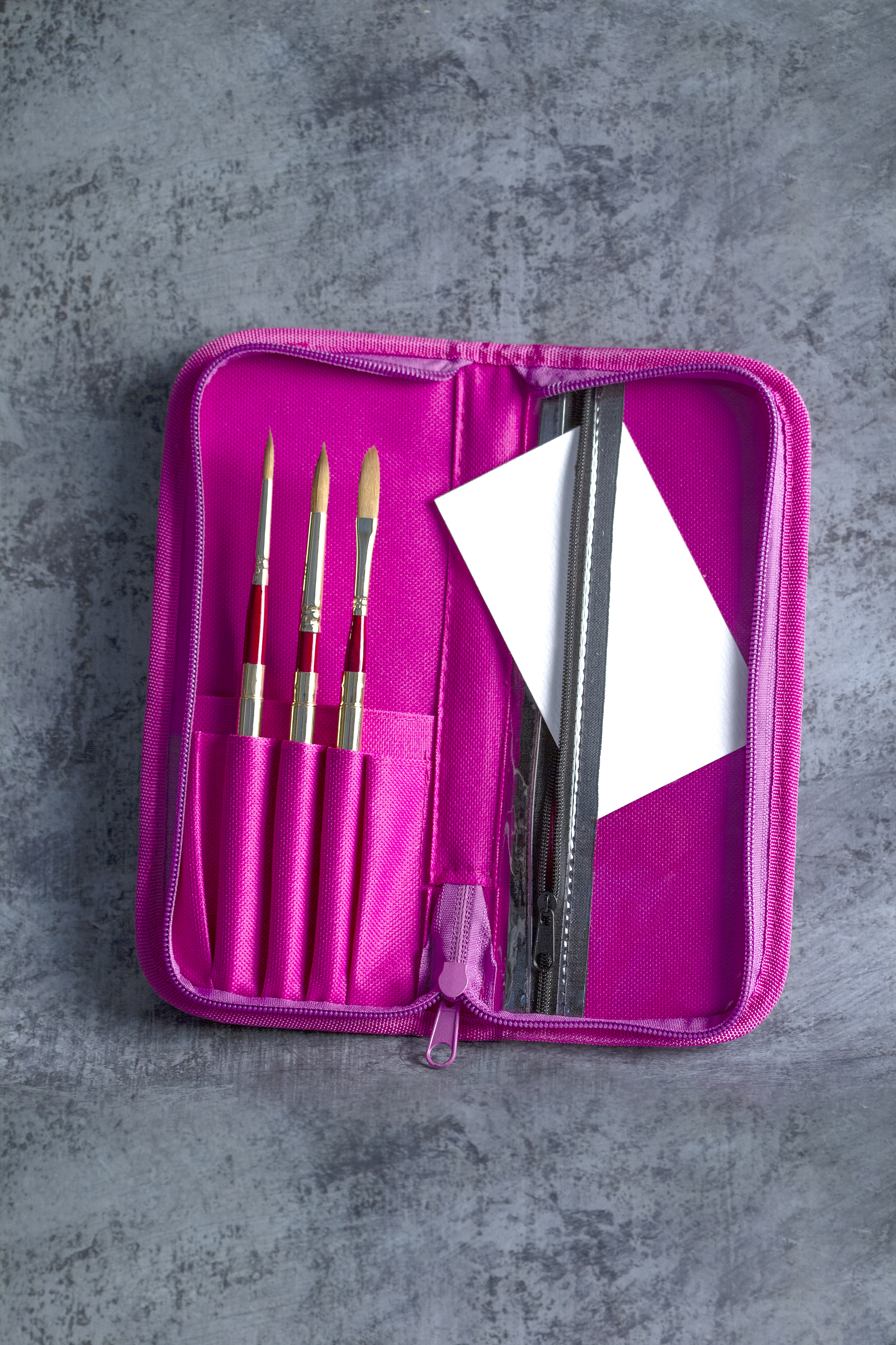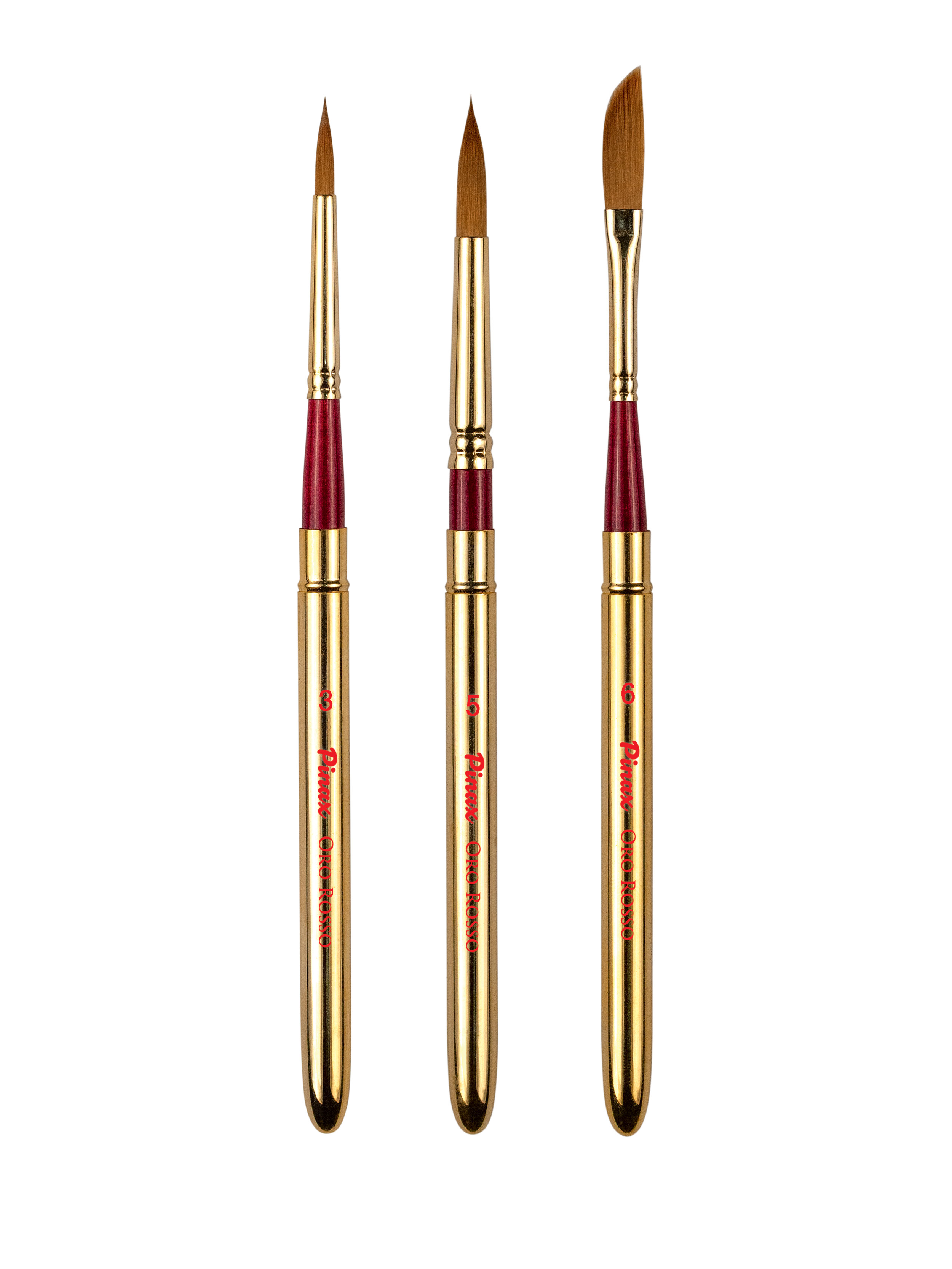 В наборе три складных кисти Oro Rosso в удобном пенале на молнии. Кисти серии Oro Rosso изготавливаются из универсальной синтетики с ворсом чуть толще имитации белки. Пучок кисти сочетает в себе беличью мягкость с упругостью и управляемостью синтетики. Кисти этой серии подходят как для любителей, так и для профессионалов. Кисти Oro Rosso подходят для декоративно-оформительского творчества и хобби. Предназначены для акварели, жидкого акрила, так же могут быть использованы и для масла в лессировочных техниках.