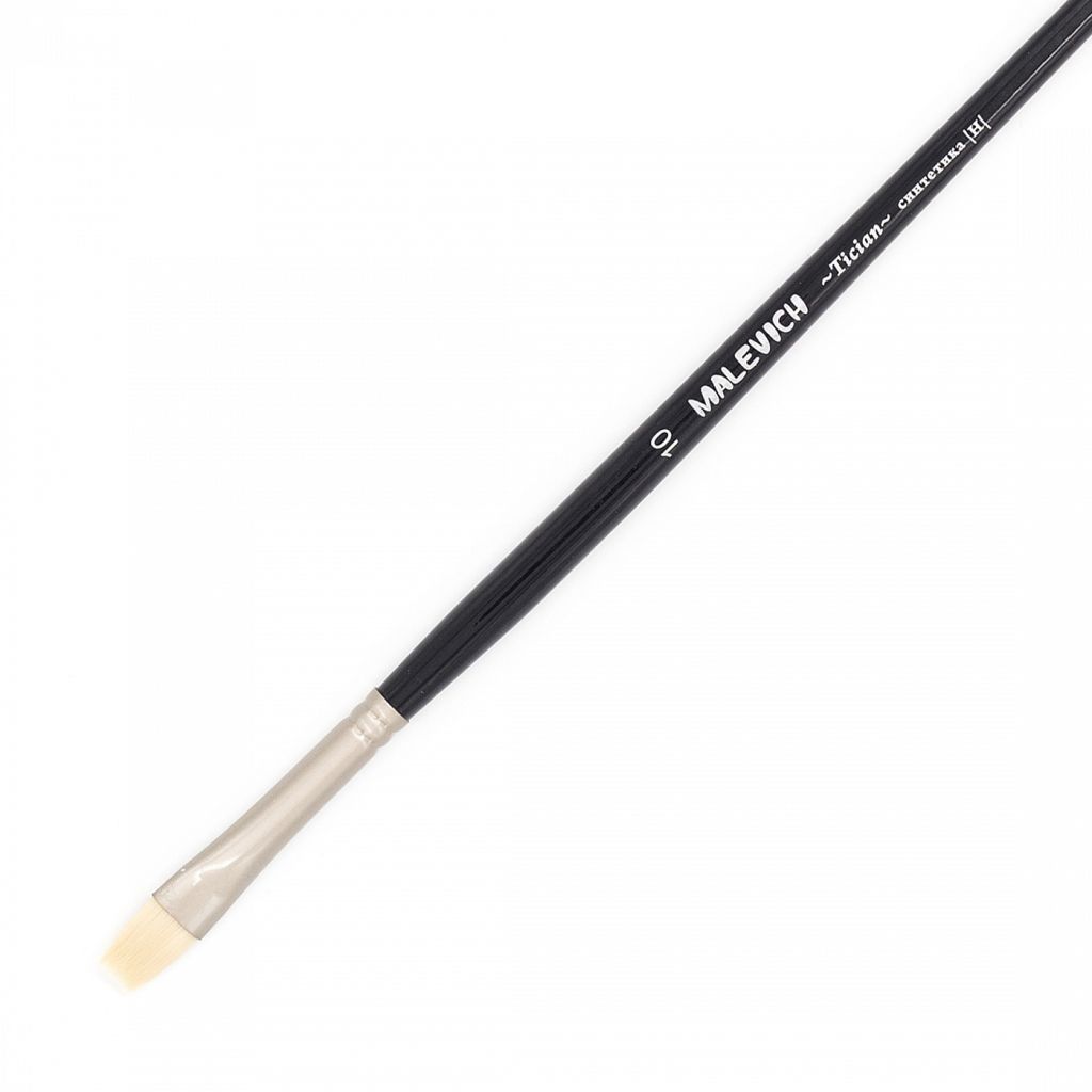 Кисти серии Tician изготовлены из жесткой синтетики белого цвета имитирующей щетину. Этот ворс отлично подходит для густых красок таких как масло, акрил, гуашь, темпера. Кисти выполнены в благородной цветовой гамме. Матовая втулка с теплым металлическим оттенком, черный лак и лаконичная маркировка делают эти кисти не только надежным художественным инструментом, но и красивым аксессуаром. Кисть держит свою форму даже при частом использовании, ворс прочно закреплен, а втулка не расшатывается со временем. Ручка кисти длинная - 25 см. Длина ворса (выставка) короткая. Номер кисти соответствует диаметру пучка в миллиметрах