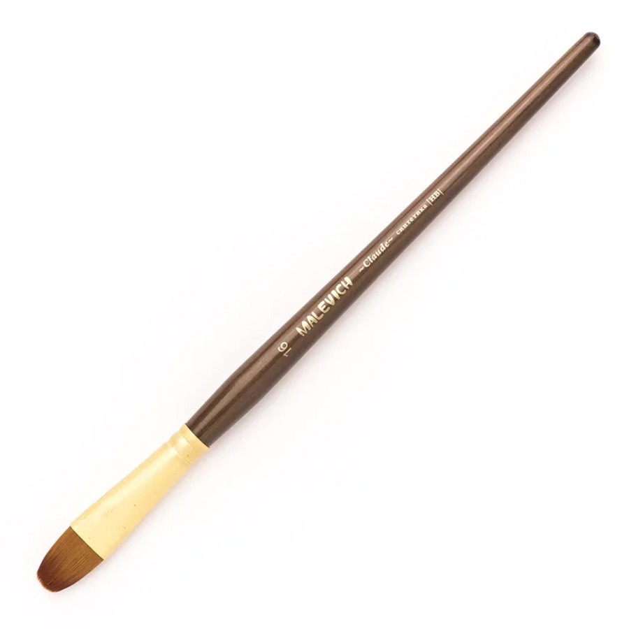 Кисти серии "Claude" ("Клод") от компании "Малевичъ" изготовлены из синтетики золотистого цвета (Shining golden synthetic), имитирующей колонковый волос. Золотистая синтетика это - ворс средней жесткости, который отлично подходит для густых красок: для масла, акрила, гуаши, темперы. Кисти выполнены в благородной цветовой гамме: матовая золотая втулка, коричневый прозрачный лак и лаконичная маркировка делают эти кисти не только надежным художественным инструментом, но и красивым аксессуаром. Кисть держит свою форму даже при частом использовании, ворс прочно закреплен, а втулка не расшатывается со временем. Ручка - оптимальной средней длины (18см). Выставка (длина ворса) - короткая. Номер кисти соответствует диаметру обоймы в миллиметрах.