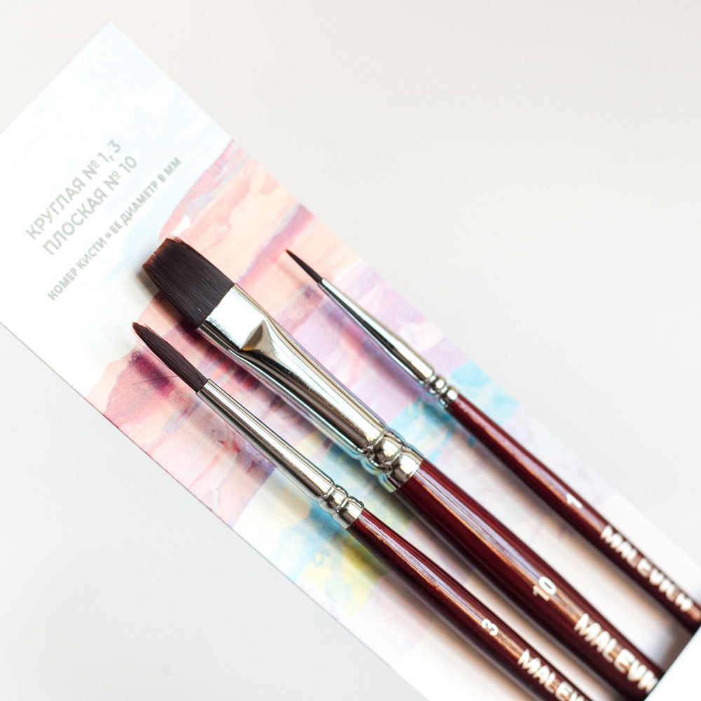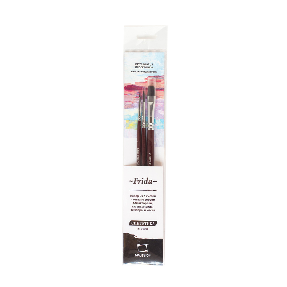 Синтетические нейлоновые кисти серии "Frida" от Малевичъ - это кисти с мягким эластичным ворсом. Имеют острый кончик, который долго не стирается. Подходят для акварели и гуаши, хороши для академической техники живописи и лессировок, хорошо держат воду. По свойствам напоминают натуральную белку. Латунная обойма с антикоррозийным покрытием и двойным обжимом. Березовая ручка длиной 18см покрыта глянцевым темно-красным лаком. Длина ворса (выставка) короткая. Номер кисти соответствует диаметру в мм. В набор входят 3 кисти: круглые кисти №1 и №3, плоская №10.