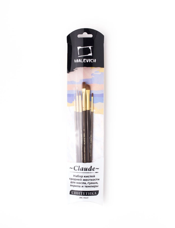 Кисти серии Claude изготовлены из синтетики золотистого цвета (Shining golden synthetic) имитирующей ворс колонка. Это ворс средней жесткости, который отлично подходит для густых красок таких как масло, акрил, гуашь, темпера. Кисти выполнены в благородной цветовой гамме. Матовая золотая втулка, коричневый прозрачный лак и лаконичная маркировка делают эти кисти не только надежным художественным инструментом, но и красивым аксессуаром. Кисть держит свою форму даже при частом использовании, ворс прочно закреплен, а втулка не расшатывается со временем. В наборе 6 кистей: круглые 1 и 3, плоские 4 и 10, овальная 6, скошенная 8.