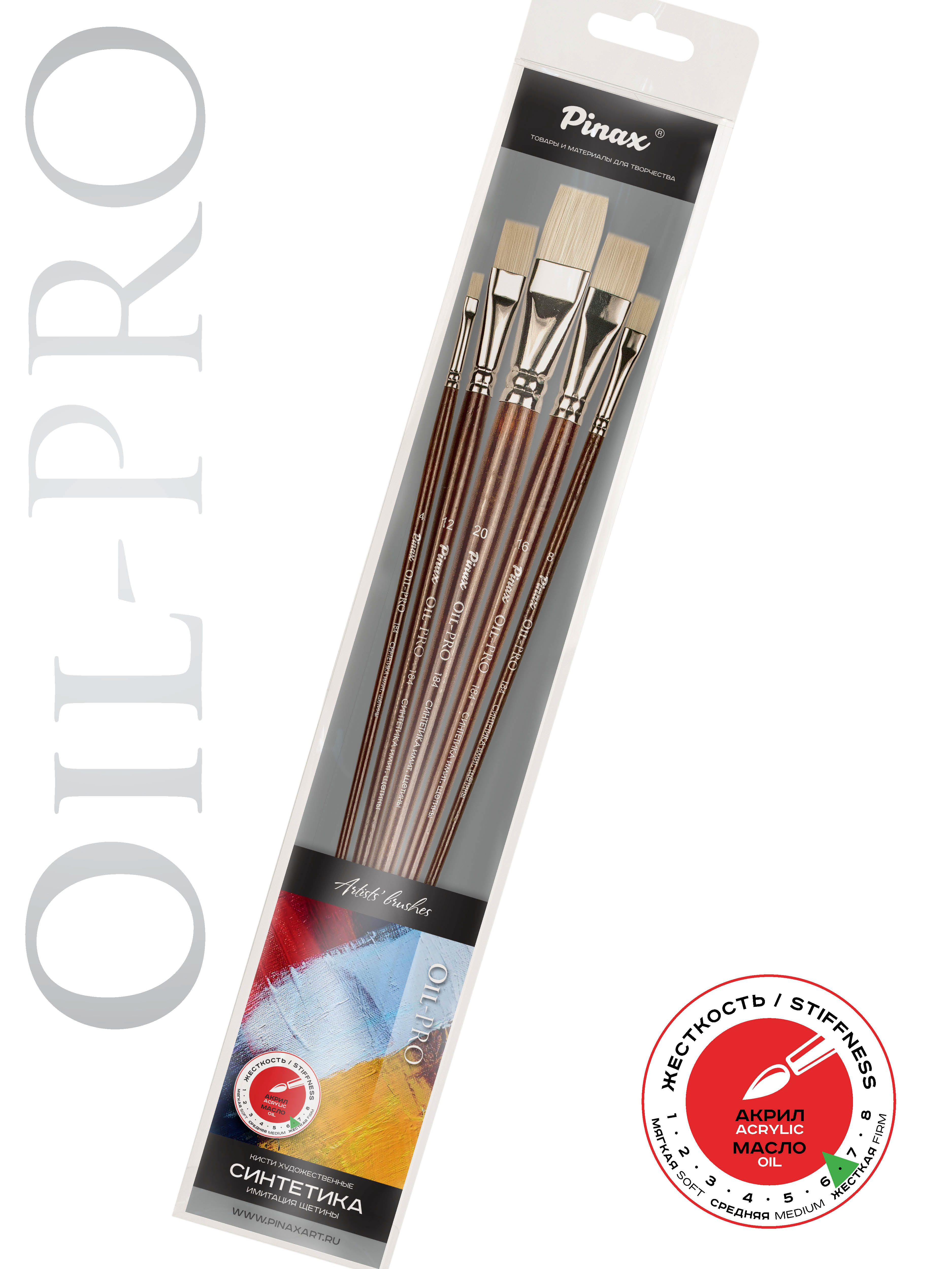 О наборе: в наборе 5 плоских кистей из синтетики разных размеров. Характеристика: кисти серии Pinax Oil-PRO сделаны из высококачественной синтетической имитации щетины производства Японии и выдержат любые испытания самыми густыми красками и растворителями, обеспечивая равномерное нанесение масляных или акриловых красок даже без разбавления - прямо из тюбика. Белая синтетика Pinax Oil-PRO имитирует структуру натуральной свиной щетины - комбинация сверхпрочных и гладких синтетических волокон нескольких различных диаметров удерживает максимальный объем краски на кисти, так, как это делают расщепленные кончики на волосках натуральной щетины из региона Chungking, однако синтетика отличается большей износостойкостью и лучше удерживает краску, равномерно отдавая ее на холст. В отличие от кистей из натуральной щетины, такая кисть лучше держит форму независимо от степени приложенного давления, что дает больше контроля мазка и позволяет точнее наносить цвет. Применение: кисти Pinax Oil-PRO идеально подходят для работы густыми красками — масло и акрил. Производство: данный товар представлен брендом Pinax. Pinax — мировой бренд товаров, который представлен на российском рынке с начала XXI века. Изначально компания производила только кисти для художественных работ, но затем расширила свое производство и не потеряв качество своей продукции начала производить холсты, мольберты и аксессуары для художников. Сейчас ассортимент включает в себя большое количество наименований.