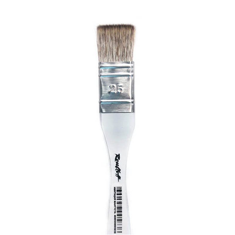 О серии: плоская кисть-флейц из синтетики, имитирующей волос мангуста, имеет более жесткую структуру, чем волос белки, но более мягкую, чем свиная щетина; применима для работы с такими красками, как акрил, гуашь, темпера, тушь и акварель. Такая кисть является незаменимым инструментом для увлажнения бумаги крупного формата, для заливки однородным или градиентным тоном. Ворс хорошо впитывает влагу и также хорошо отдает ее на полотно, что позволяет наносить широкий слой краски одним мазком и добиваться интересной формы пятна лишь поворотом руки. Прозрачное оргстекло, из которого изготовлена ручка, исключает вероятность проникновения краски или влаги внутрь материала, что увеличивает износостойкость изделия. Также, используя край самой ручки, можно добиться необычной фактуры бумаги в декоративной или абстрактной живописи Применение: используется для художественных работ акварельными, гуашевыми и масляными красками. Производство: изготавливаются под брендом Roubloff, который был основан в 1988 году в Кировской области (Россия). Кировская область – один из центров народных промыслов в России. Здесь же занимаются разведением пушных зверей, чей мех является идеальным материалом для кистей. Продукция бренда Roubloff – кисти самого разного назначения, размера и формы. Весь материл, используемый при производстве продукции, проходит отбор, чтобы каждый клиент получил лучшие кисти для своих работ. Кисти марки Roubloff являются одними из лучших в России.