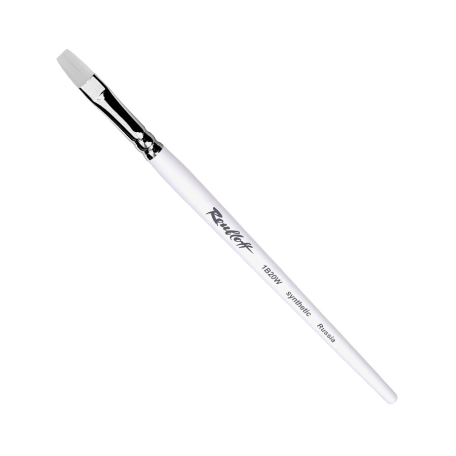 Плоская кисть с белым синтетическим ворсом позволяет работать с красками различной вязкости в живописной и декоративной технике. Хромированная медная обойма надёжно защищает ворсинки изделия и прочно скрепляет с белой глянцевой ручкой. Такой цвет волоса позволяет более точно отслеживать чистоту оттенка краски, что увеличивает качество работы с точки зрения колористики, а новый подход к технологии создания синтетики увеличил эластичность и упругость материала. Прямоугольная форма кисти позволяет работать с заливками широкими полосами, изображать архитектурные строения, с лёгкостью моделируя объем таких материалов, как кирпич и камень, а также наносить структурные пятна при начальной стадии компоновки.