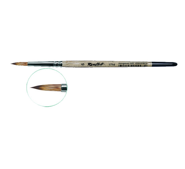 О серии: кисти серии «1Т14» изготавливаются из синтетики, имитирующей волос мангуста. В серии представлены кисти от №0 до №10. Характеристика: для изготовления кистей этой серии использован синтетический волос, который по своим свойствам максимально напоминает ворс мангуста. Кисти из такого материала более жёсткие, чем кисти из белки, но мягче кистей из щетины. Волос кисти не равномерно окрашен: по длине бело-коричневый, а у кончика кисти более темный. Кисть имеет пучок круглой формы с укороченной вставкой (ворс короткий). Крепление ворса к черенку осуществлено за счет медной хромированной обоймы. Кисть выполнена на пёстрой ручке покрытой глянцевым лаком. Применение: кисти серии «1Т14» в основном используются для работы с акварельными красками. На усмотрение художника возможно использование кистей в других техниках живописи. Производство: изготавливаются под брендом Roubloff, который был основан в 1988 году в Кировской области (Россия). Кировская область – один из центров народных промыслов в России. Здесь же занимаются разведением пушных зверей, чей мех является идеальным материалом для кистей. Продукция бренда Roubloff – кисти самого разного назначения, размера и формы. Весь материл, используемый при производстве продукции, проходит отбор, чтобы каждый клиент получил лучшие кисти для своих работ. Кисти марки Roubloff являются одними из лучших в России.