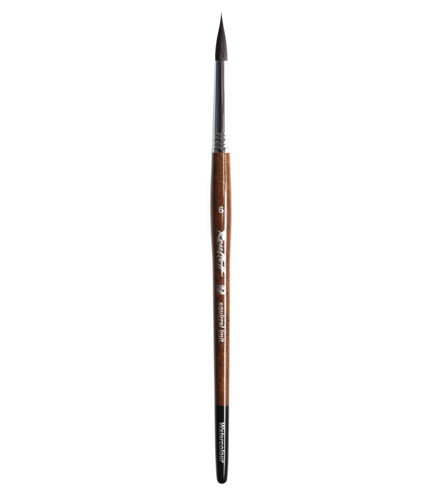 Профессиональная круглая кисть из уникального микса синтетических ворсов «имитация белки люкс» для акварельной живописи и иллюстрации. В составе смеси мягкий волнистый акварельный ворс имитирующий натуральный беличий, удерживающий в кисти много воды, и гладкий упругий устойчивый к износу ворс, который обеспечивает контролируемость и долговечность вершинки кисти, а также возможность набирать на кисть насыщенный цвет. Острая устойчивая вершинка позволяет рисовать тонкие линии и прописывать мелкие детали. Короткая фигурная эргономичная ручка, покрытая химстойким лаком, удобна для работы в студии и на пленэре.