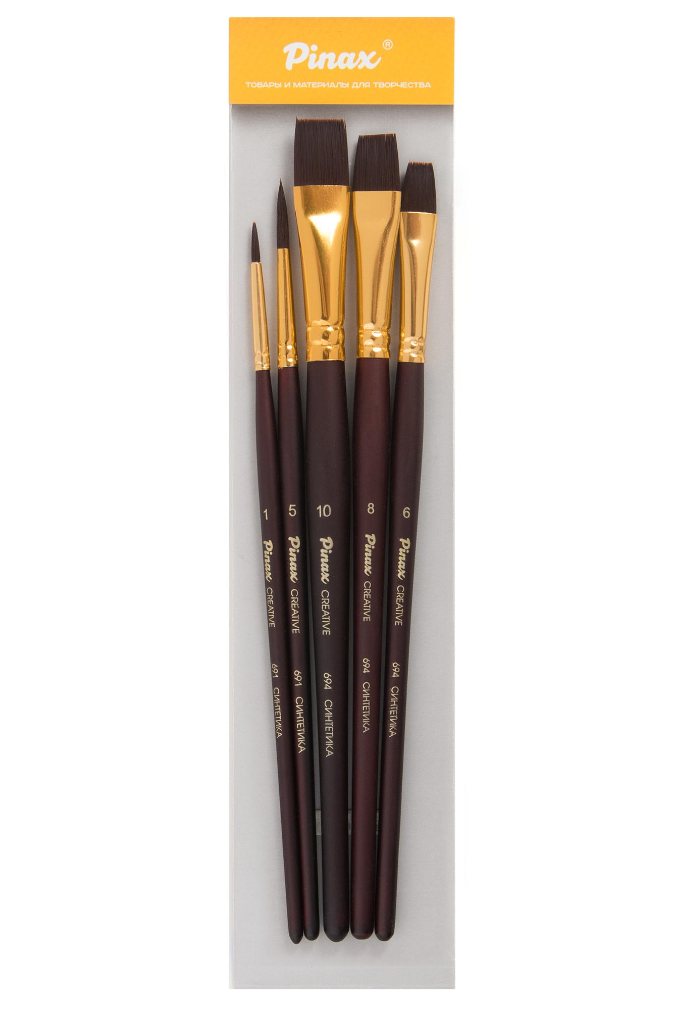 Комплектация: в данный набор вошли кисти серии «Creative», которые изготовлены из жесткой синтетики. В набор входит 5 кистей (круглые №1, 5 и плоские №6, 8, 10). Блистерная упаковка. Характеристика: кисти этой серии изготавливаются из жесткой синтетики бордового цвета. Волос таких кистей достаточно жесткий и упругий. Фактура волосков и форма кисти позволяет набирать большое количество краски. Кисти изготовлены на короткой деревянной ручке, покрытой матовым лаком. Применение: кисти этой серии универсальны в своем применении. Они подходят для художников всех уровней и могут использоваться для работы разными художественными красками и лаками. Производство: данный товар представлен брендом Pinax. Pinax — мировой бренд товаров, который представлен на российском рынке с начала XXI века. Изначально компания производила только кисти для художественных работ, но затем расширила свое производство и не потеряв качество своей продукции начала производить холсты, мольберты и аксессуары для художников. Сейчас ассортимент включает в себя большое количество наименований.
