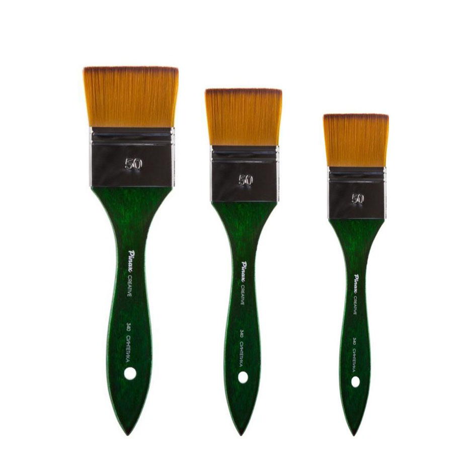 О серии: кисти серии «Pinax Creative 340» изготавливаются из синтетического волокна. В данной серии представлены кисти трех размеров №30, 40 и 50 (номер кисти соответствует ширине рабочей поверхности). Характеристика: кисти этой серии изготавливаются из высококачественной синтетики золотисто-оранжевого цвета (Golden Taklon). Волос таких кистей имеет среднюю жесткость и хорошо держит свою форму. Дополнительным преимуществом кистей из синтетического волоса считается то что он гипераллергенный. Кисти «Pinax Creative 340» отличаются своей формой – они имеют широкую рабочую поверхность. Кисти изготовлены на деревянной ручке, покрытой полупрозрачным лаком зеленого цвета. Крепление ворса к черенку кисти выполнено за счет алюминиевой втулки. Применение: кисти этой серии универсальны в своем применении. Они подходят для художников всех уровней и могут использоваться для работы разными художественными красками и лаками. Кисти такой формы удобны для окрашивания больших поверхностей. Производство: данный товар представлен брендом Pinax. Pinax — мировой бренд товаров, который представлен на российском рынке с начала XXI века. Изначально компания производила только кисти для художественных работ, но затем расширила свое производство и не потеряв качество своей продукции начала производить холсты, мольберты и аксессуары для художников. Сейчас ассортимент включает в себя большое количество наименований.
