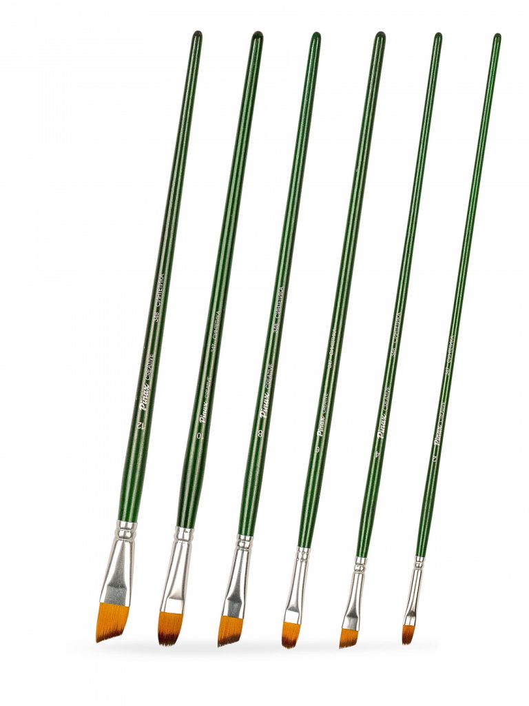 О наборе: в наборе 6 кистей с пучком плоской и скошенной формой разных размеров. Характеристика: кисти этой серии изготавливаются из высококачественной синтетики золотисто-оранжевого цвета (Golden Taklon). Волос таких кистей имеет среднюю жесткость и хорошо держит свою форму. Кисти изготовлены на длинной деревянной ручке, покрытой полупрозрачным лаком зеленого цвета. Крепление ворса к черенку кисти выполнено за счет алюминиевой втулки. Применение: кисти этой серии универсальны в своем применении. Они подходят для художников всех уровней и могут использоваться для работы разными художественными красками и лаками. Производство: данный товар представлен брендом Pinax. Pinax — мировой бренд товаров, который представлен на российском рынке с начала XXI века. Изначально компания производила только кисти для художественных работ, но затем расширила свое производство и не потеряв качество своей продукции начала производить холсты, мольберты и аксессуары для художников. Сейчас ассортимент включает в себя большое количество наименований.