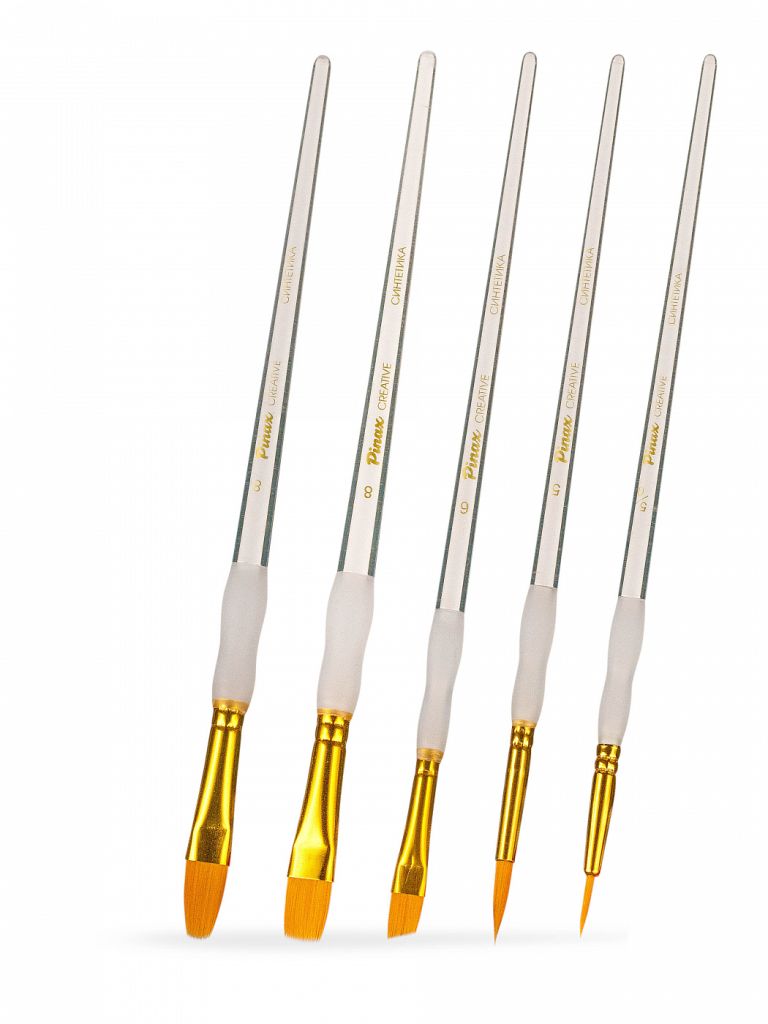 О наборе: в наборе 5 кистей с пучком разной формы разных размеров на короткой ручке с эргономичной вставкой в зоне обхвата. Характеристика: кисти из универсальной золотистой синтетики — эластичный и управляемый синтетический ворс отлично набирает краску и равномерно отдает на поверхность, а тонкий кончик у круглых кистей позволяет работать с мельчайшими деталями. Применение: кисти серии подходят для широкого круга потребителей, они одинаково удобны для учащихся и для профессиональных художников. Кисти универсальны в применении, походят для выполнения работ различными видами красок — акрил, акварель, гуашь. Производство: данный товар представлен брендом Pinax. Pinax — мировой бренд товаров, который представлен на российском рынке с начала XXI века. Изначально компания производила только кисти для художественных работ, но затем расширила свое производство и не потеряв качество своей продукции начала производить холсты, мольберты и аксессуары для художников. Сейчас ассортимент включает в себя большое количество наименований.