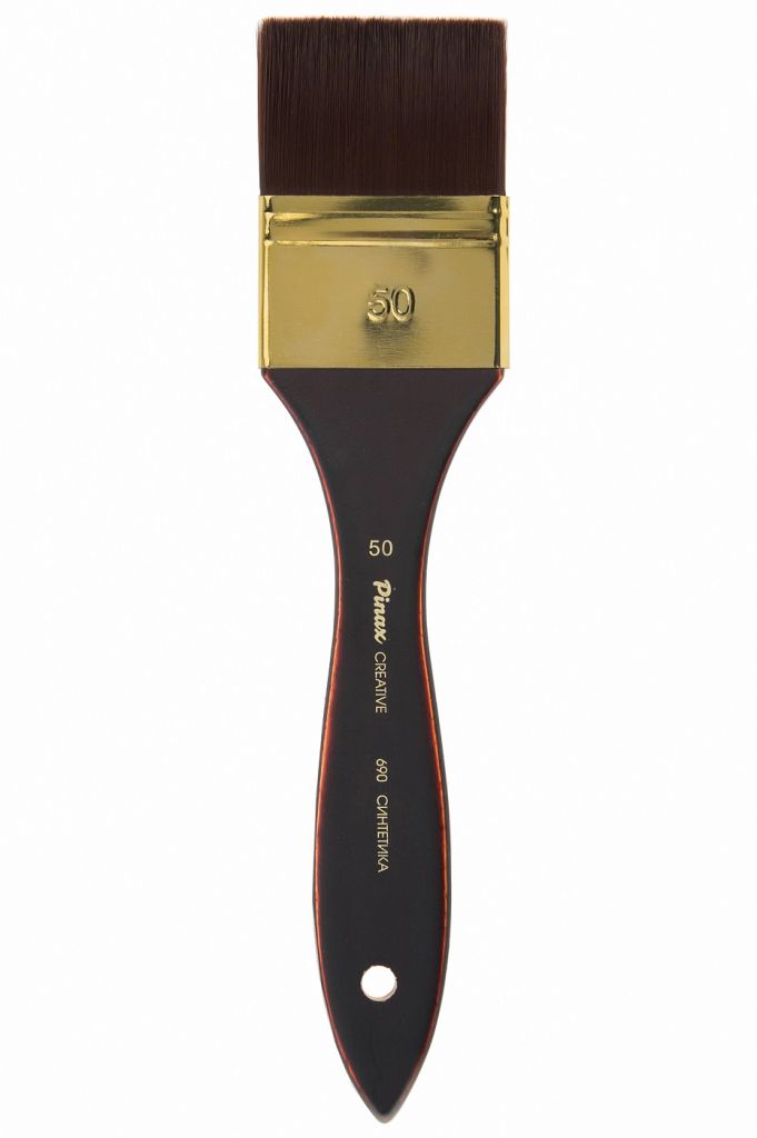 О серии: серия кистей «Creative 690» представлена широкими плоскими кистями (флейцами). В серию входят кисти следующих номеров: № 25, 30, 40, 50 и 75. Номер кисти соответствует ее ширине (в миллиметрах). Все кисти выпускаются поштучно. Характеристика: для изготовления кистей «Creative 690» используется специальная жесткая синтетика. Кисти данной серии отличаются жесткостью и упругостью. Пучок кистей плоский широкий. Крепление ворса к ручке выполнено медной обоймой. Ручки кистей выполнены из натуральной древесины и покрыты полупрозрачной глянцевой эмалью глубокого гранатового оттенка. Применение: кисти этой серии подходят для любителей и профессионалов. Кисти «Creative 690» подходят для густых красок, как акрил и масло, но на усмотрение художника могут быть использованы с другими материалами. Форма кисти удобна для окрашивания больших площадей. Производство: данный товар представлен брендом Pinax. Pinax — бренд художественных товаров, который представлен на российском рынке с начала XXI века. Изначально компания производила только кисти для художественных работ, но затем расширила свое производство и не потеряв качество своей продукции начала производить холсты, мольберты и аксессуары для художников. Сейчас ассортимент включает в себя большое количество наименований.