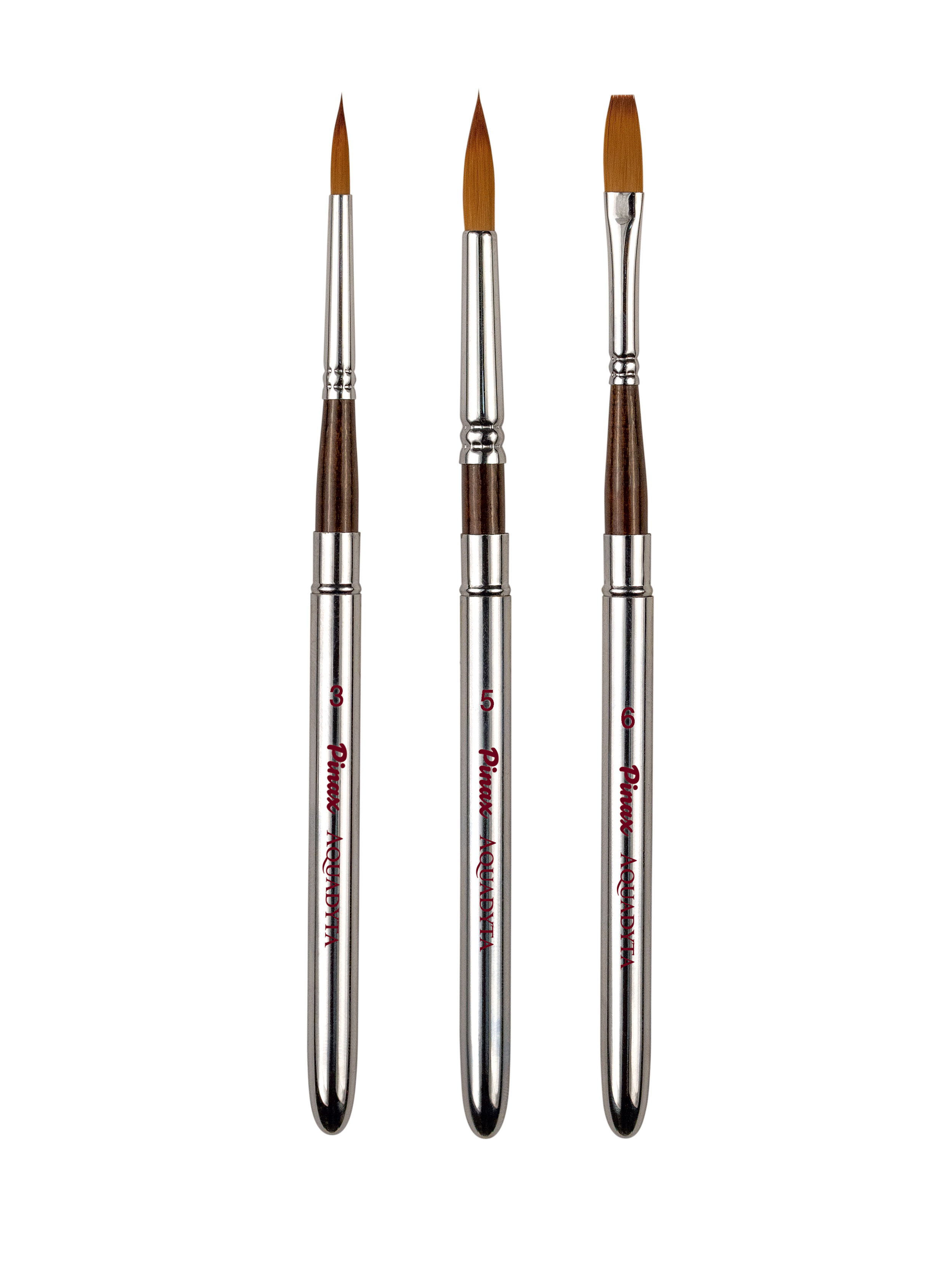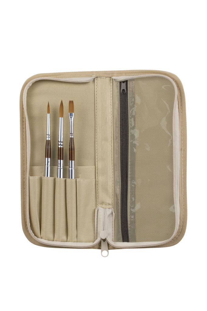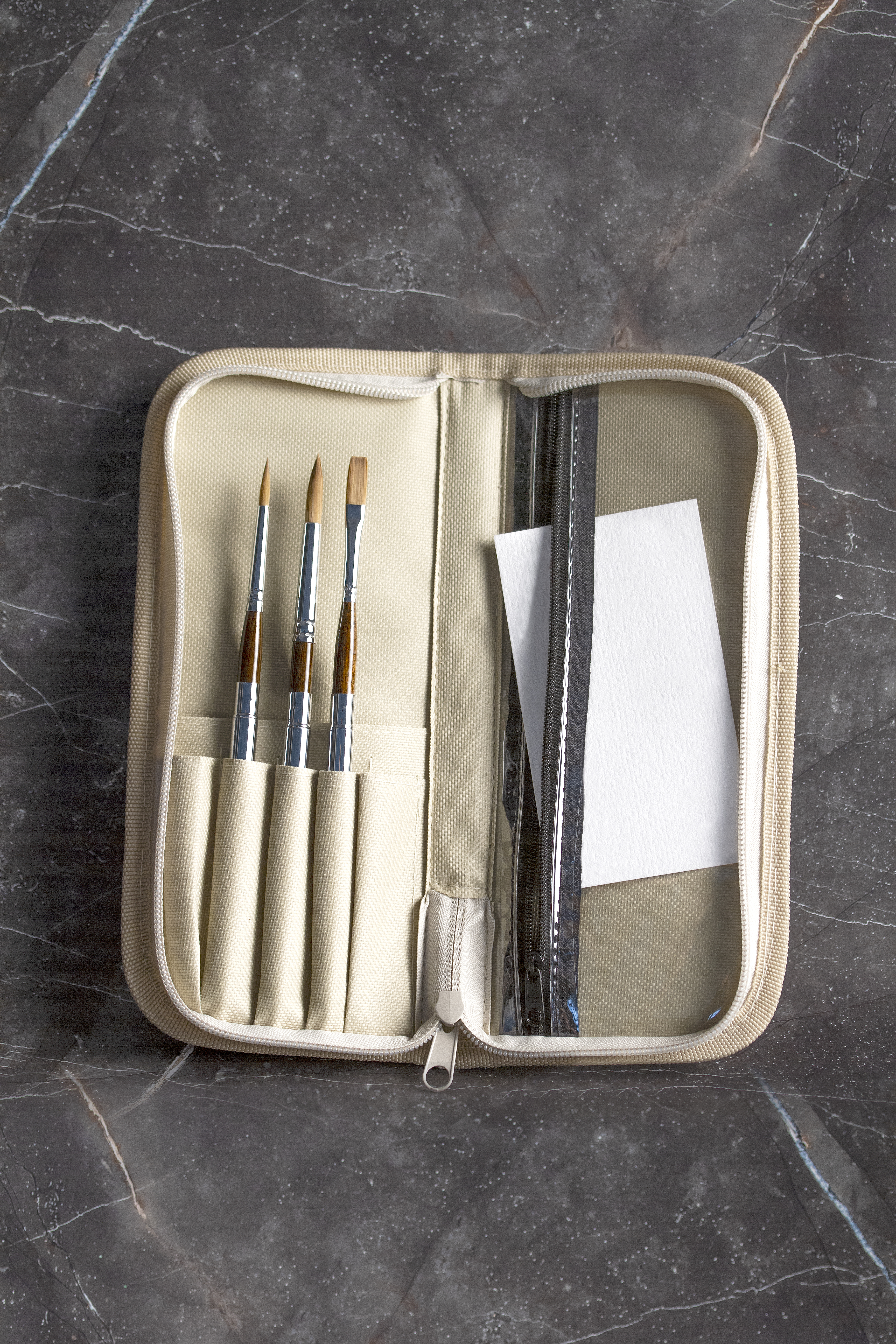 Набор состоит из трёх кистей серии AQUADYTA (круглые №3 и №5, плоская №6) на складной ручке в удобном пенале на молнии. Кисти серии AQUADYTA выполнены из высококачественной японской синтетики, имитирующей ворс колонка. Структура натурального колонкового волоса повторена в каждой ворсинке — средняя жесткость у основания для лучшего контроля и мягкий управляемый заостренный кончик. Особая структура поверхности ворсинок способствует удержанию краски и равномерной отдаче на бумагу. Кисти предназначены для работы с акварелью и другими красками на водной основе.