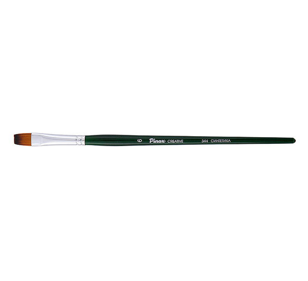 О серии: кисти серии «Pinax Creative 344» изготавливаются из синтетического волокна. В данной серии представлен широкий размерный ряд кистей. Характеристика: кисти этой серии изготавливаются из высококачественной синтетики золотисто-оранжевого цвета (Golden Taklon). Волос таких кистей имеет среднюю жесткость и хорошо держит свою форму. Дополнительным преимуществом кистей из синтетического волоса считается то что он гипераллергенный. Кисти серии «Pinax Creative 344» имеют пучок плоской формы. Кисти изготовлены на короткой деревянной ручке, покрытой полупрозрачным лаком зеленого цвета. Крепление ворса к черенку кисти выполнено за счет алюминиевой втулки. Применение: кисти этой серии универсальны в своем применении. Они подходят для художников всех уровней и могут использоваться для работы разными художественными красками и лаками. Производство: данный товар представлен брендом Pinax. Pinax — мировой бренд товаров, который представлен на российском рынке с начала XXI века. Изначально компания производила только кисти для художественных работ, но затем расширила свое производство и не потеряв качество своей продукции начала производить холсты, мольберты и аксессуары для художников. Сейчас ассортимент включает в себя большое количество наименований.